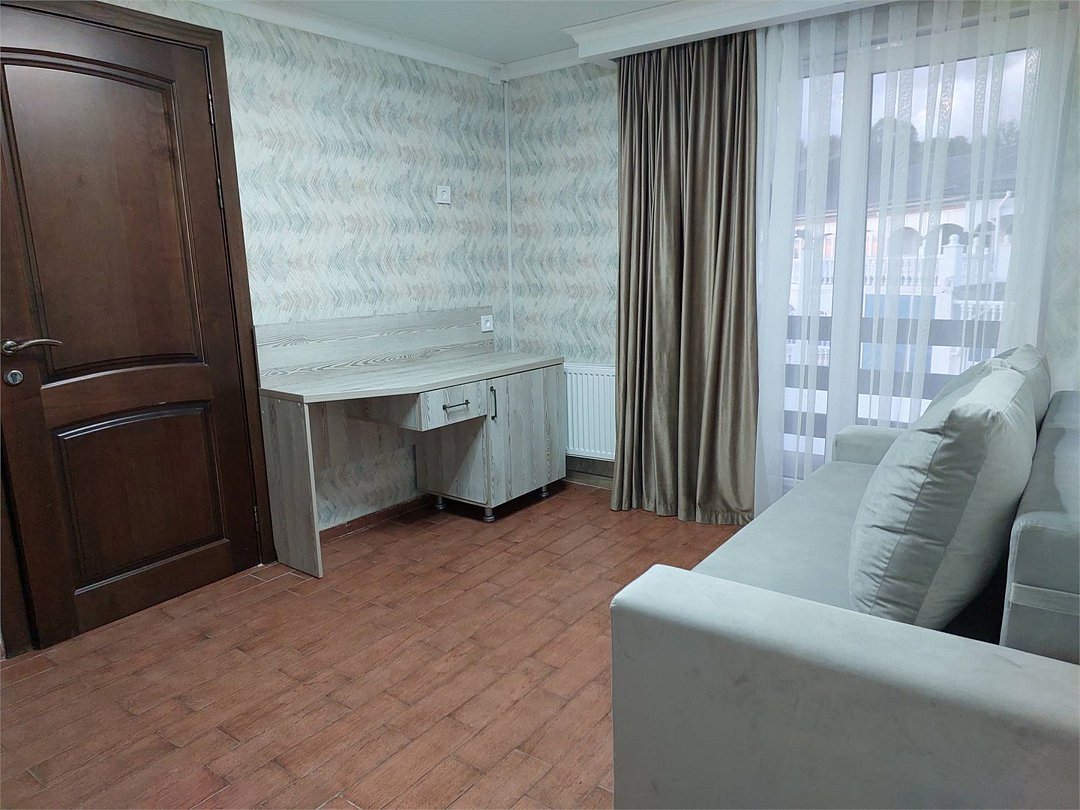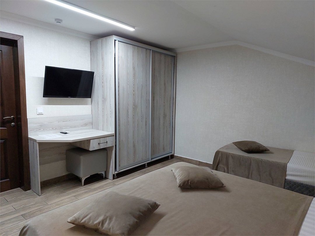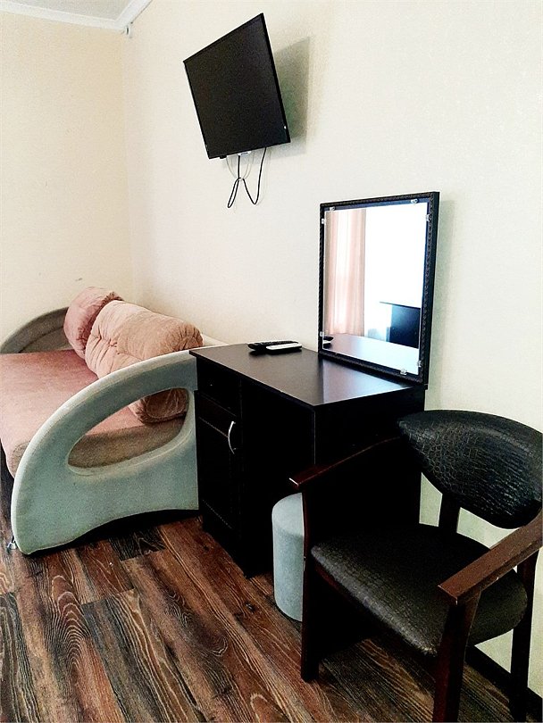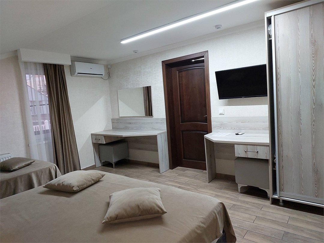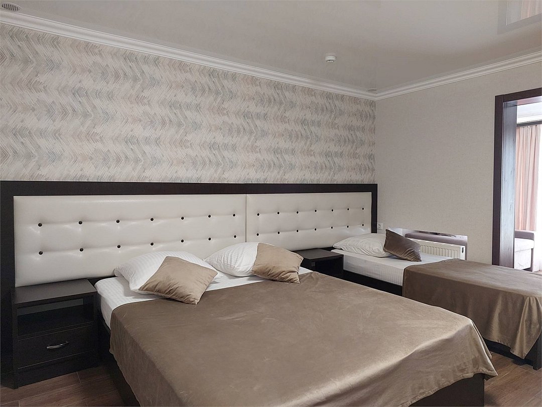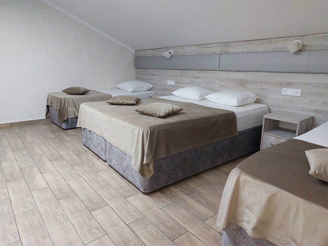 Трёхместный номер площадью 18 кв.м. Подходит для размещения 3 человек. Имеет спальню с приятным интерьером. В номере: 1 двуспальная кровать и раскладной диванчик. Имеется телевизор, кондиционер, шкаф, вешалка, рабочий стол, стулья, холодильник. Индивидуальная ванная комната: душ, раковина, туалет. В стоимость входит: Постельное бельё, полотенца, мыло. WI-Fi бесплатно на всей территории. Бесплатная общественная парковка на территорией.Услуги и удобства