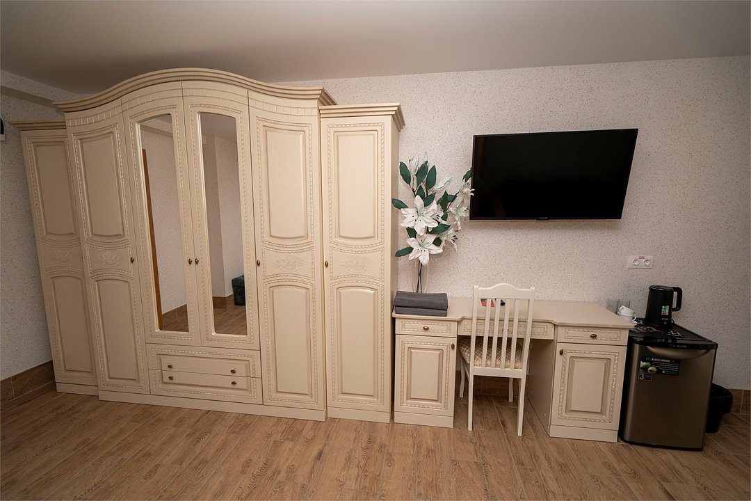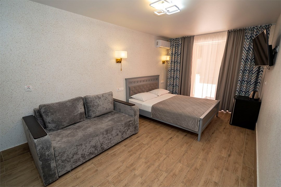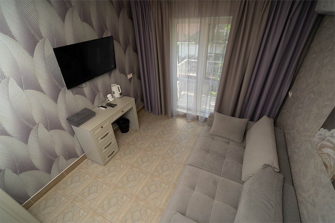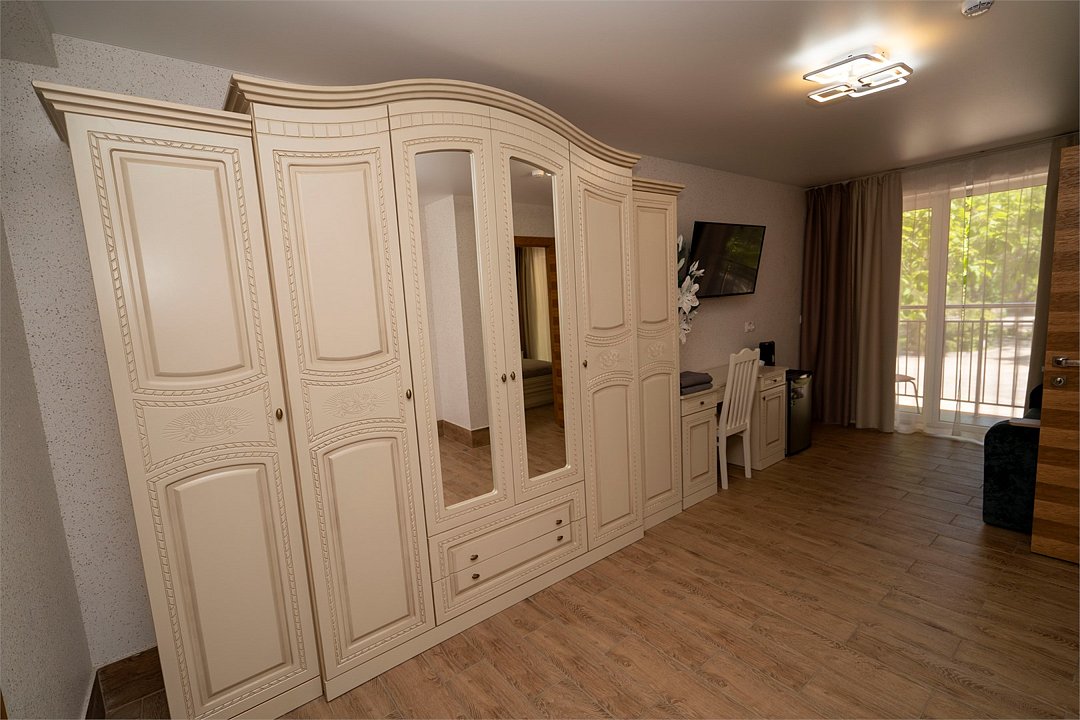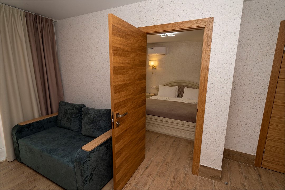 Просторный улучшенный номер идеально подходит как для пары, так и для семьи с детьми. Вариации номеров с диваном для размещения до 4-х человек и с раскладным креслом для размещения до 3-х человек. В номере: двуспальная кровать, раскладной диван или раскладное кресло, телевизор, сплит-система, чайник и чайный набор, мини-холодильник, сан. узел с душевой кабиной, фен, набор косметики для душа, полотенца, халаты, тапочки, WiFi.Услуги и удобства