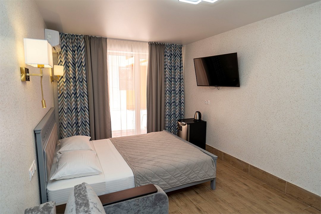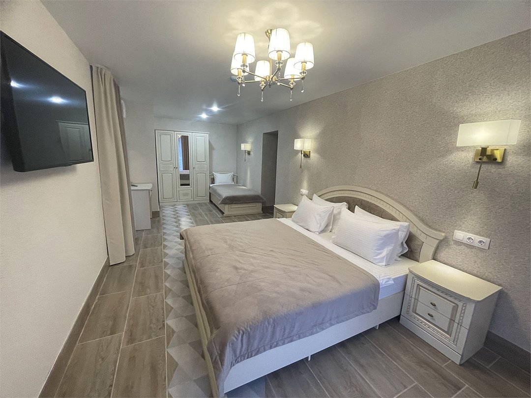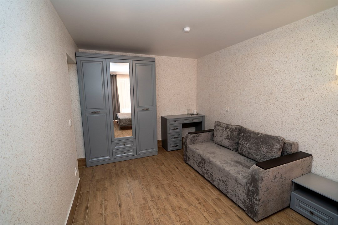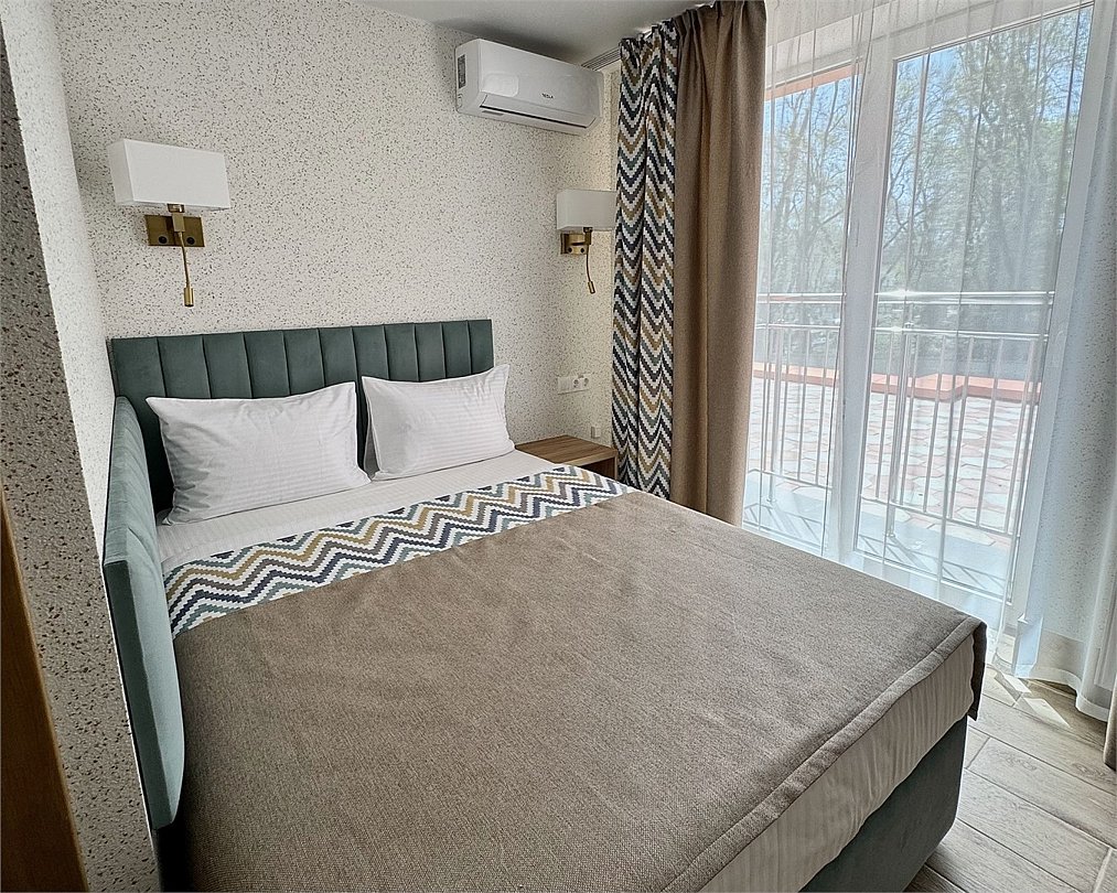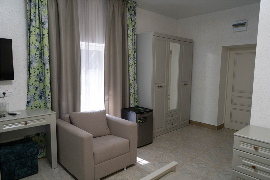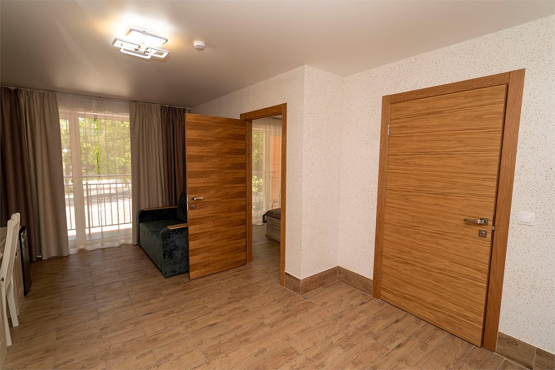 Просторный улучшенный номер идеально подходит как для пары, так и для семьи с детьми. Вариации номеров с диваном для размещения до 4-х человек и с раскладным креслом для размещения до 3-х человек. В номере: двуспальная кровать, раскладной диван или раскладное кресло, телевизор, сплит-система, чайник и чайный набор, мини-холодильник, сан. узел с душевой кабиной, фен, набор косметики для душа, полотенца, халаты, тапочки, WiFi.Услуги и удобства