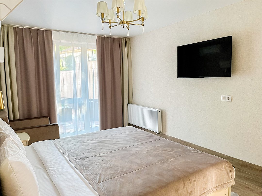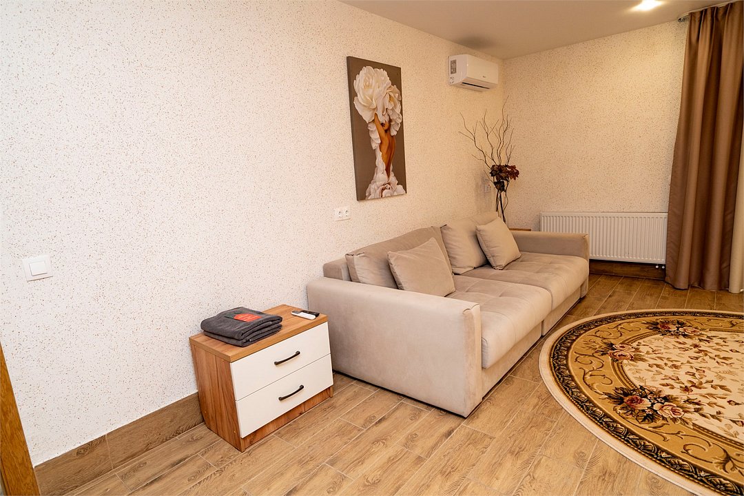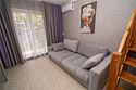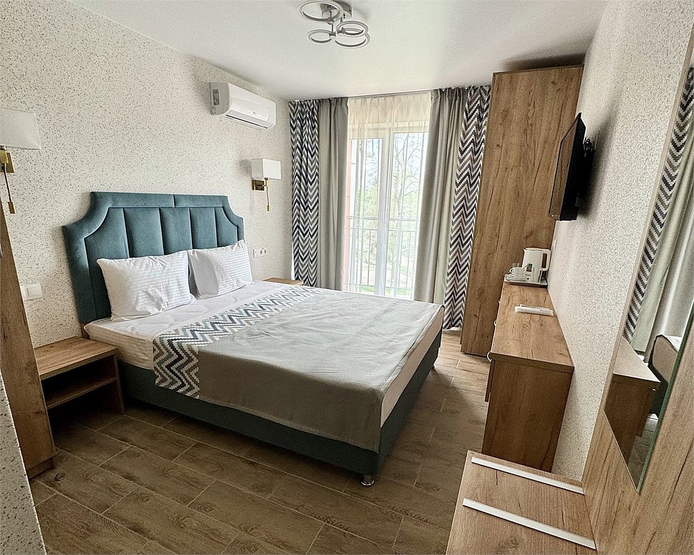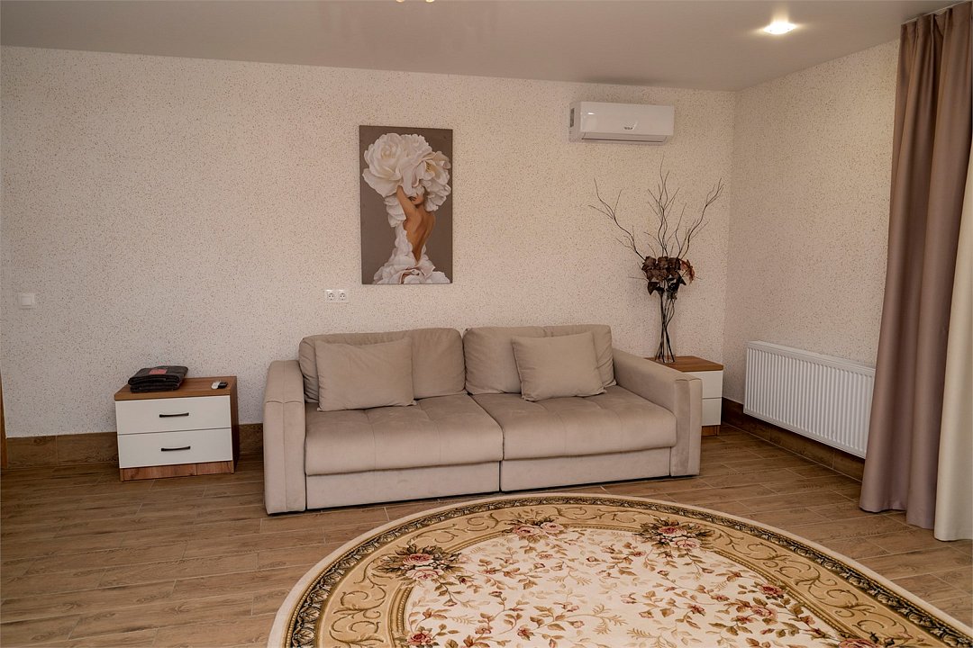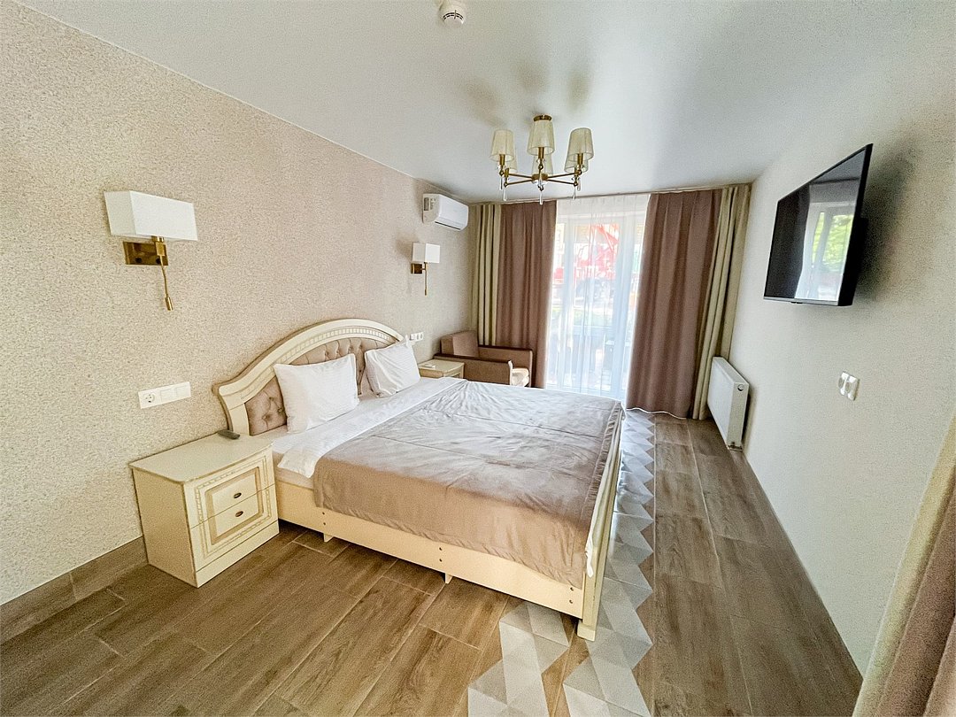 Просторный улучшенный номер идеально подходит как для пары, так и для семьи с детьми. Вариации номеров с диваном для размещения до 4-х человек и с раскладным креслом для размещения до 3-х человек. В номере: двуспальная кровать, раскладной диван или раскладное кресло, телевизор, сплит-система, чайник и чайный набор, мини-холодильник, сан. узел с душевой кабиной, фен, набор косметики для душа, полотенца, халаты, тапочки, WiFi.Услуги и удобства