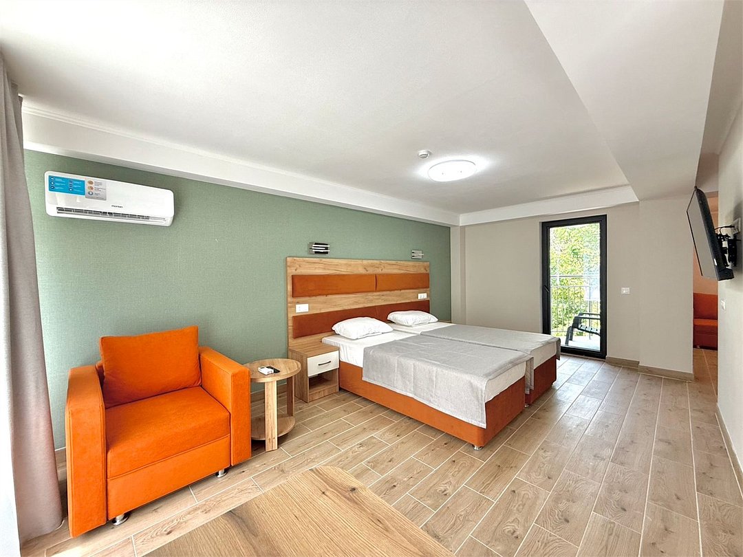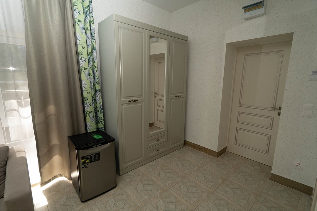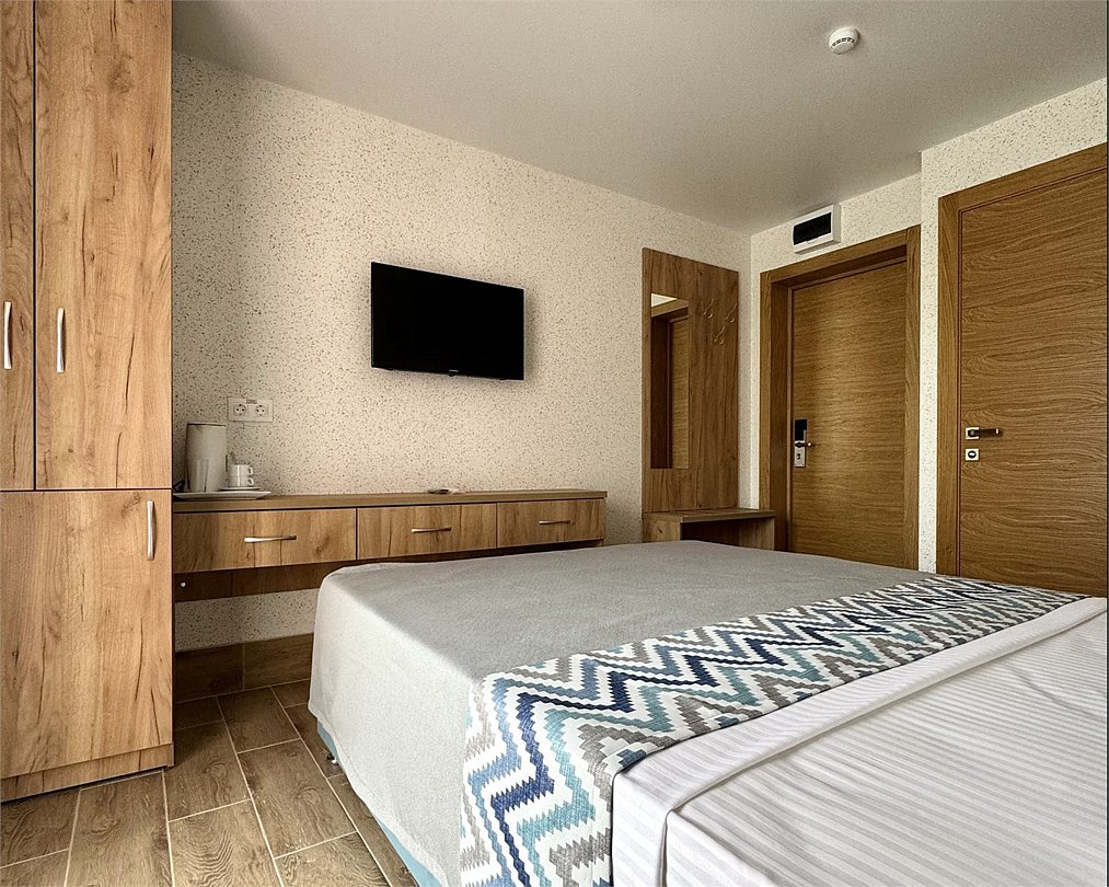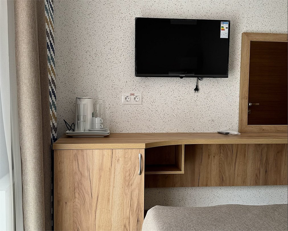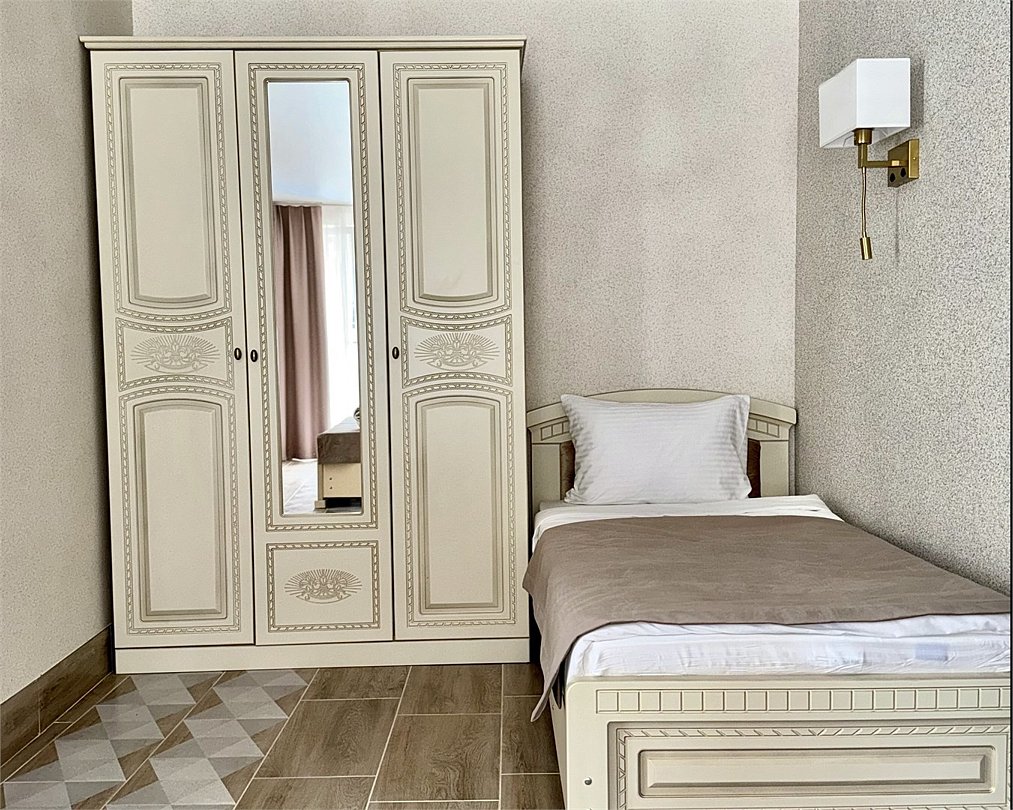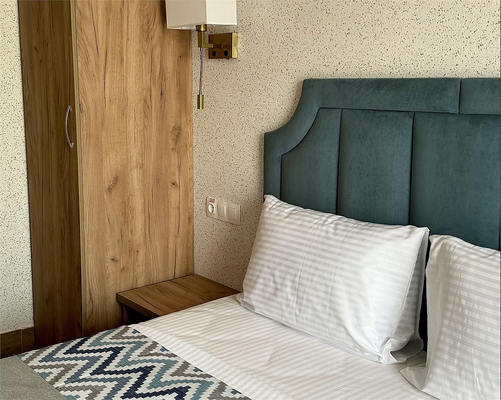 Небольшие уютные номера подходят для одноместного размещения или для размещения мамы с ребенком. В номере установлена кровать шириной 140 см. Номер оснащен спутниковым TV, кондиционером, телефоном, чайной станцией и холодильником. В ванной комнате есть фен и необходимые гигиенические принадлежности. Дополнительное место не предусмотрено.Услуги и удобства