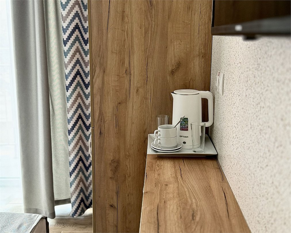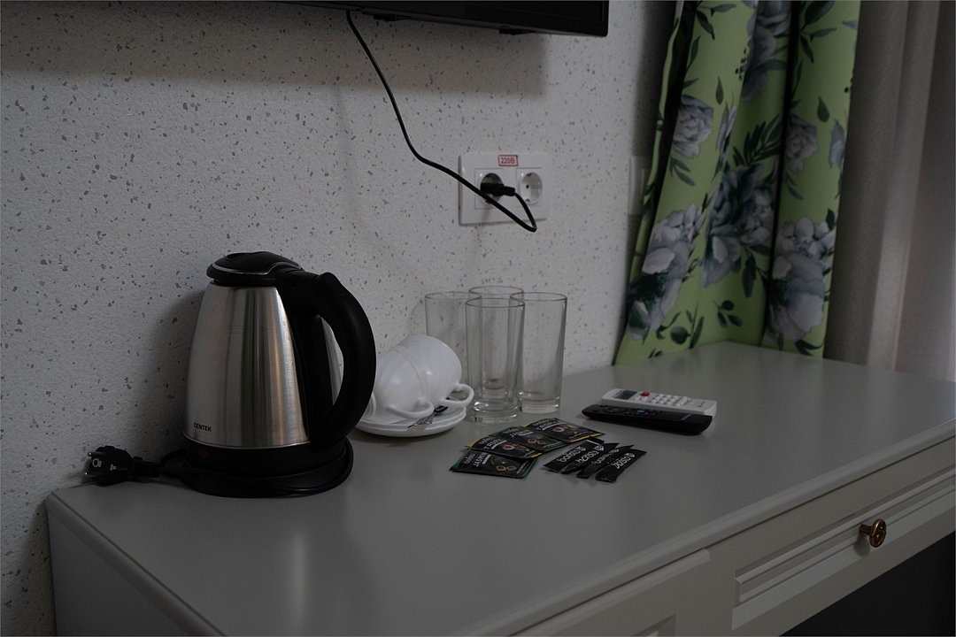 В номере есть вода, чайник и посуда. Также гостям предлагаются завтраки.