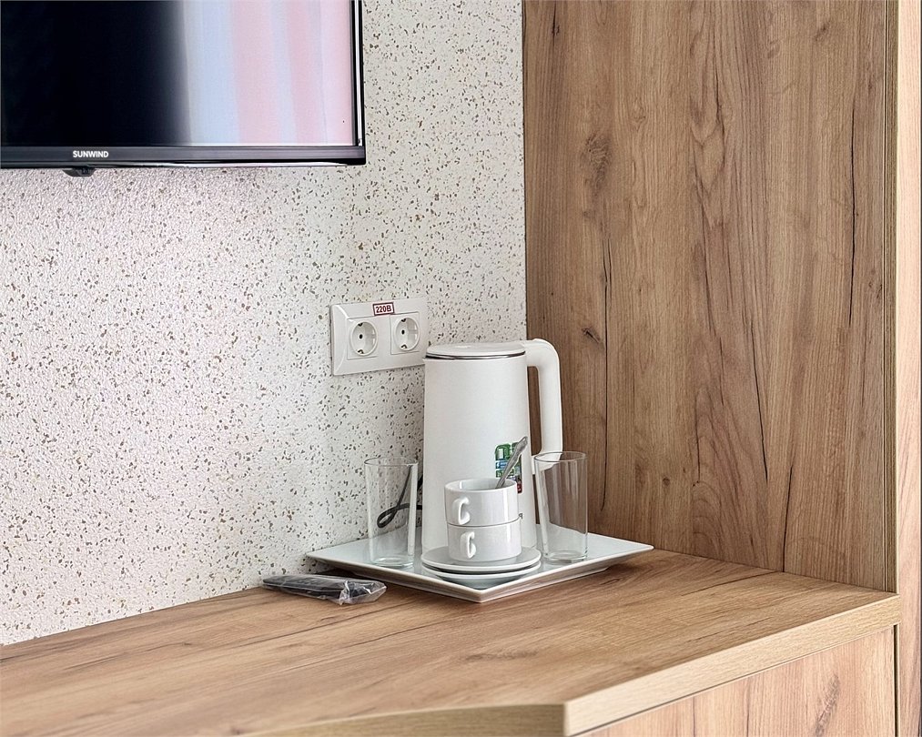 телевизор, спутниковое телевидение, Wi-Fi, кондиционер, светильник, фен, система безопасности, ванная комната, душевая кабина, банные принадлежности, халаты, банные полотенца, пляжные полотенца, тапочки, косметические средства, двуспальная кровать, тумбы, журнальный столик, зеркало, мебельный гарнитур, чайный набор, сейф, чайник, раковина, мягкая мебель, питьевая вода, душ, стаканы, туалетные средства, сплит-система, сушилка для белья, цифровое тв, мини-холодильник, кресло-кровать, чайная станция, двуспальный раскладной диван-кровать, уборка номера, набор для приготовления чая и кофе, вешалки-плечики, мыло, затемняющая штора, можно с питомцами, миска, тропический душВ гостиничном номере