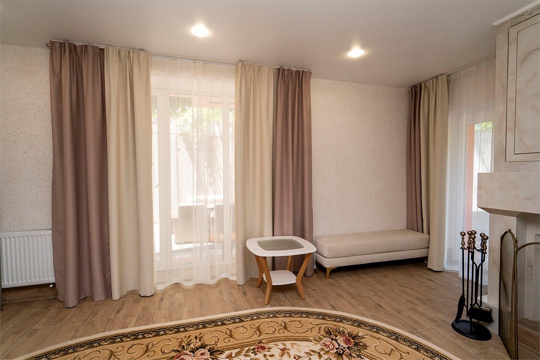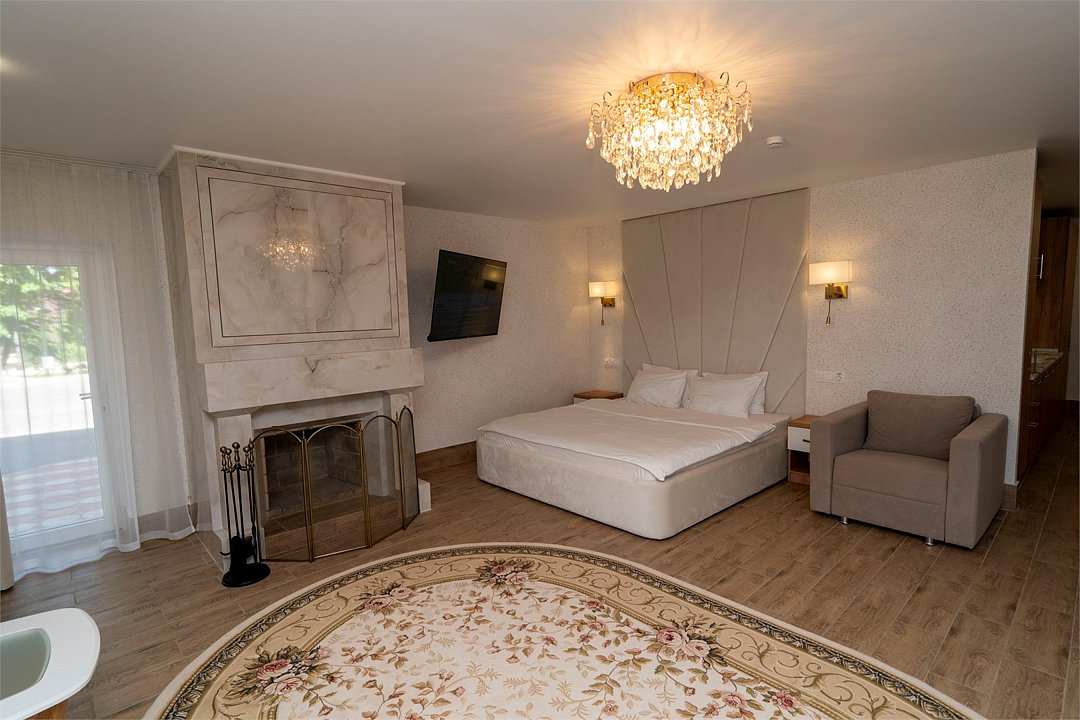 Роскошный номер Люкс представляет собой идеальное сочетание комфорта и элегантности. В номере выделена зона кухни и зона спальни. В номере имеется красивый камин, а также всё необходимое для приятного отдыха: удобная кровать для двоих 1,80, дополнительно большой диван на 2-х человек, и кресло-кровать, телевизор с диагональю 55 дюймов, сплит-система, большой сан. узел с душем, фен, WiFi. Максимальная вместимость до 5 чел.Услуги и удобства