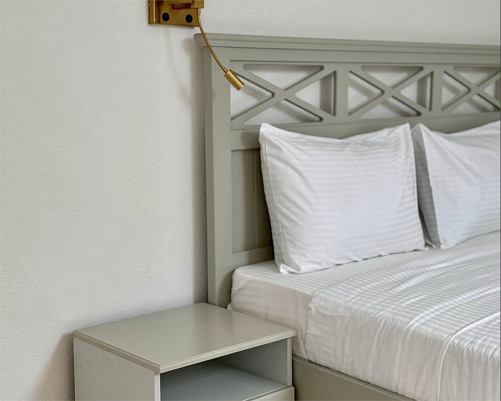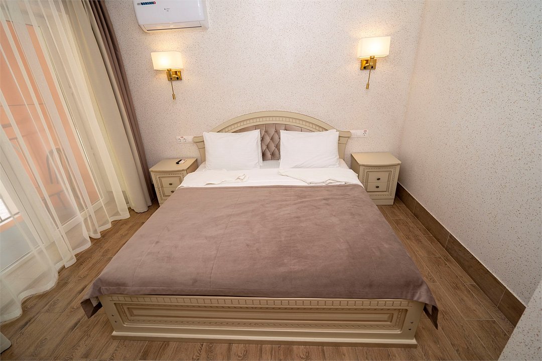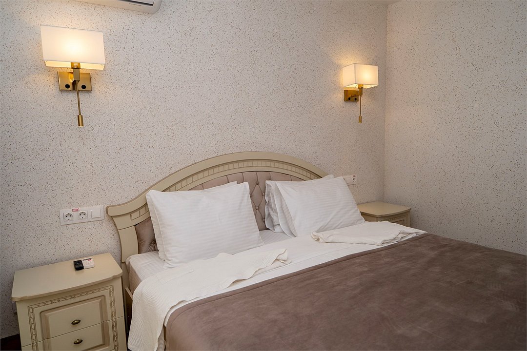 Комфортный и элегантный 2-х местный номер с одной двуспальной кроватью или двумя односпальными кроватями. Номер оснащен спутниковым TV, кондиционером, холодильником. В ванной комнате есть фен, набор полотенец для каждого гостя и необходимые гигиенические принадлежности. Установка дополнительного спального места в данной категории номера не предусмотрена.Услуги и удобства