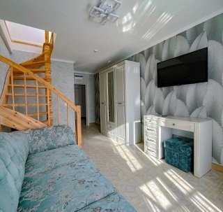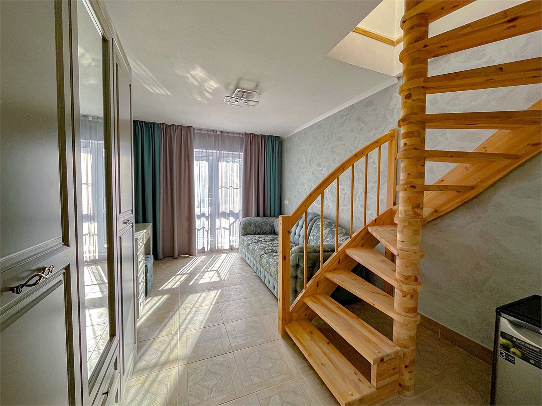 Роскошные двухуровневые апартаменты представляют собой идеальное сочетание комфорта и элегантности. Номер оснащен двуспальной кроватью, раскладным двуспальным диваном. Также для комфортного отдыха: два сан. узла, 2 телевизора, сплит-система, чайная станция, мини-кухня, холодильник, сейф.Услуги и удобства