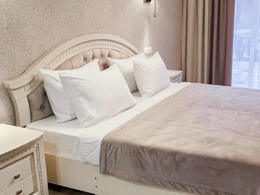 Просторный улучшенный номер идеально подходит как для пары, так и для семьи с детьми. Вариации номеров с диваном для размещения до 4-х человек и с раскладным креслом/диваном. В номере: двуспальная кровать, раскладной диван или раскладное кресло, телевизор, сплит-система, чайник и чайный набор, мини-холодильник, сан. узел с душевой кабиной, фен, набор косметики для душа, полотенца, халаты, тапочки, WiFi.Услуги и удобства