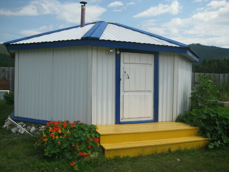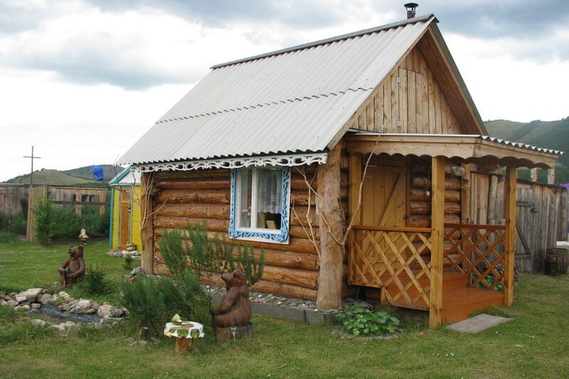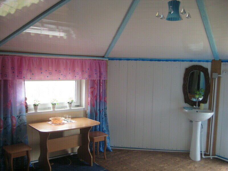 Домик деревянный. В нем есть две 1-местные кровати.столик,вешалка,зеркало,посуда,полотенца, коврики, железная отопительная печь.