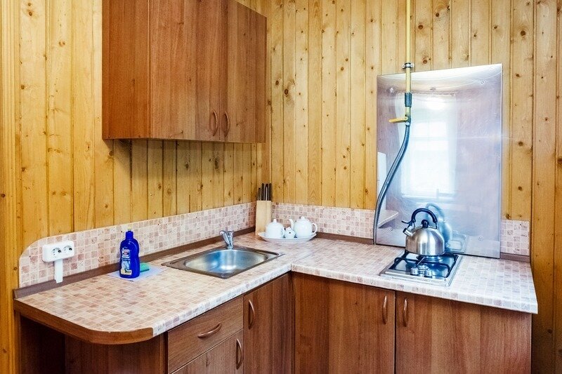 На первом этаже: прихожая с гардеробной, туалетная комната с душевой кабиной, кухня с холодильником, газовой плитой и набором всей необходимой кухонной и столовой посуды (в том числе бокалы для вина и пива), бутыль с питьевой водой (5 л), бумажные полотенца, салфетки, комната отдыха с удобным раскладным диваном, телевизором (спутниковое телевидение) с DVD плеером.