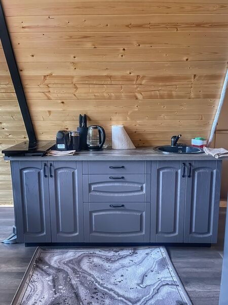 Кухня-гостиная с камином. Здесь есть вся необходимая посуда и столовые приборы, чайник, кофемашина, холодильник, микроволновая печь, ТВ, станция Алиса, шустрый интернет.