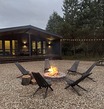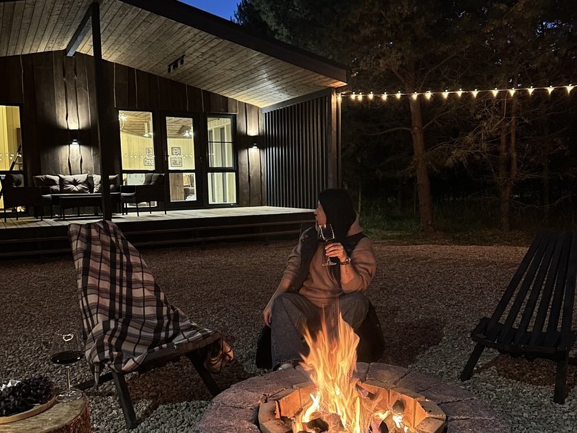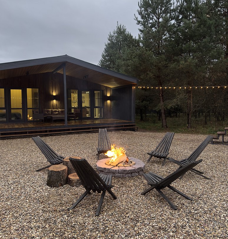 На территории дома «Wood Estate» обустроена уютная зона для костра, где можно приятно провести вечер под открытым небом, любуясь звездным небом. В распоряжении гостей — запас дров, чтобы быстро разжечь огонь и создать комфортную атмосферу.