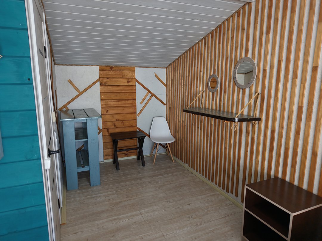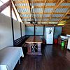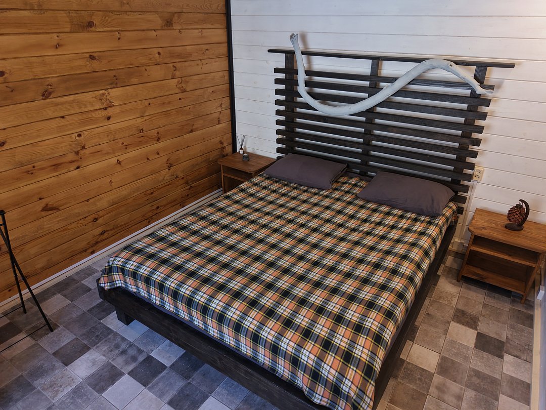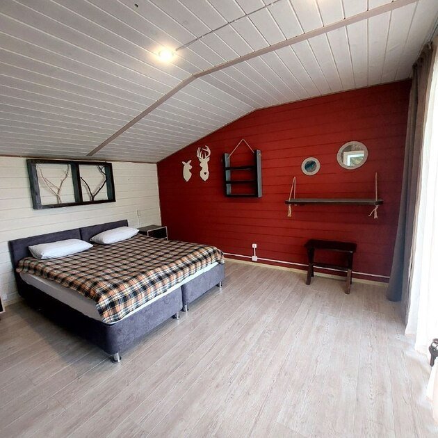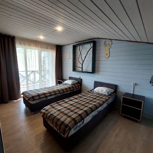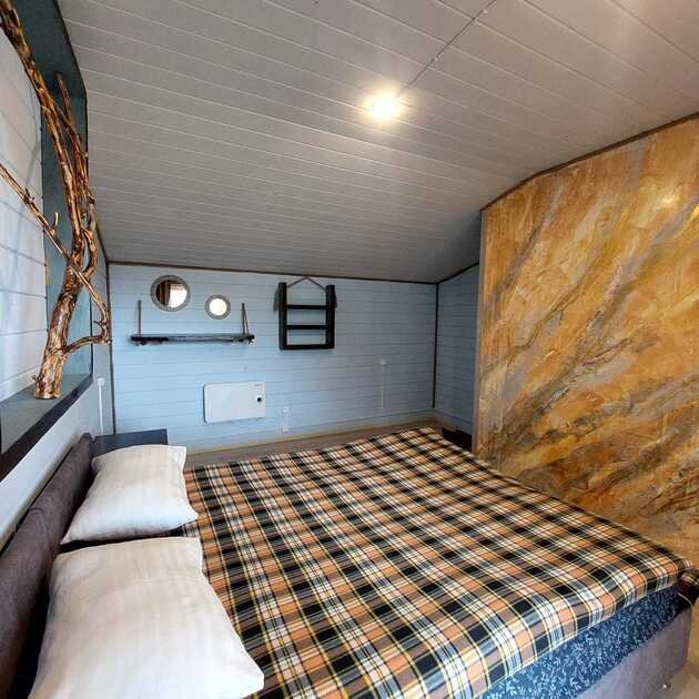 Сезонность: с мая по октябрь. Вместимость: до трех человек. Размещение: спальная комната на втором этаже с одной двуспальной кроватью или двумя раздельными кроватями (кровати типа спринг-боксы можно сдвигать или раздвигать по желанию). На первом этаже раскладной диванчик (шириной 140 сантиметров).
