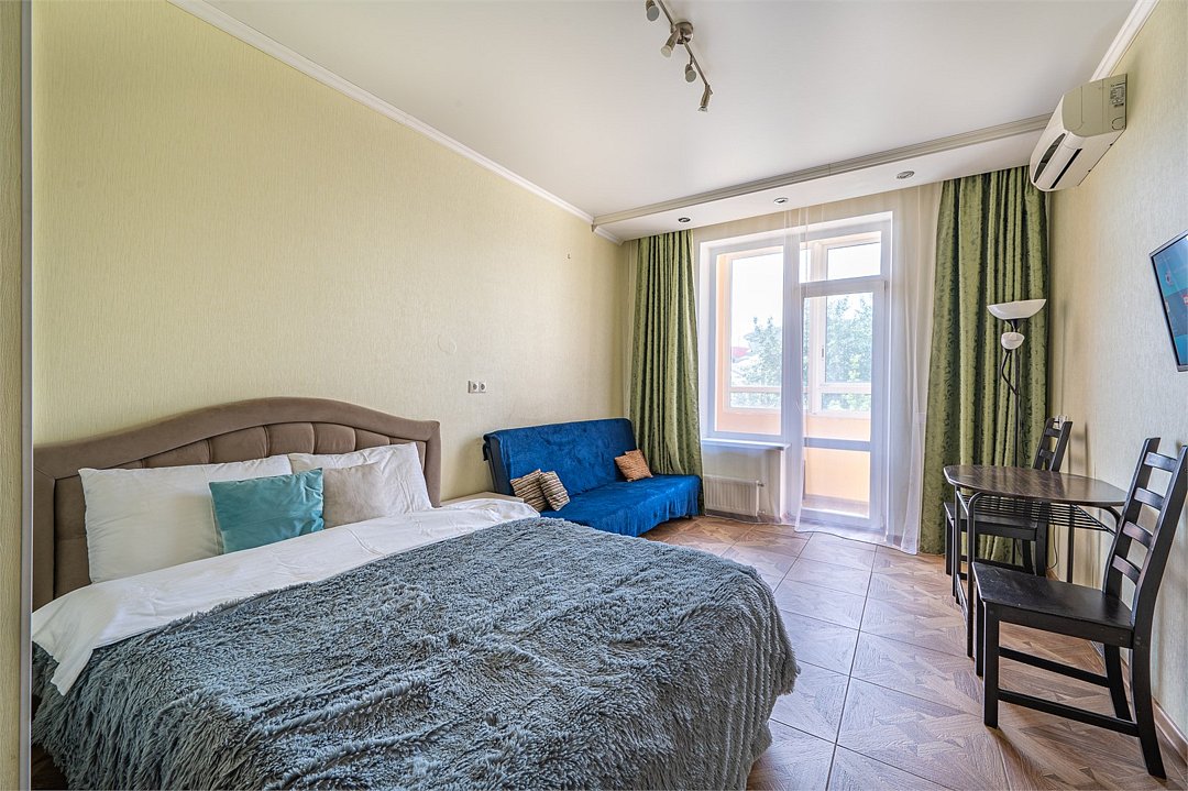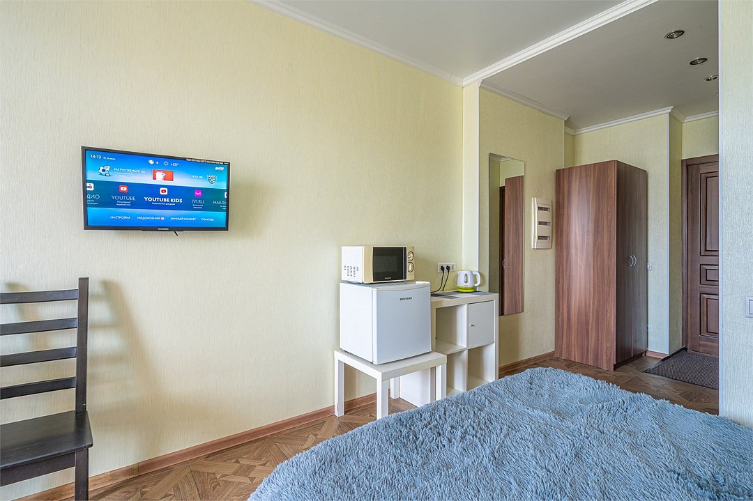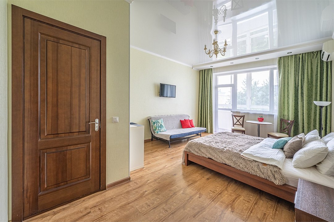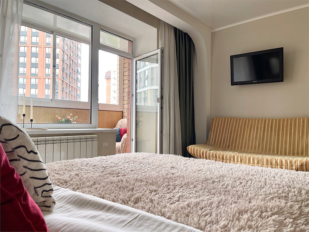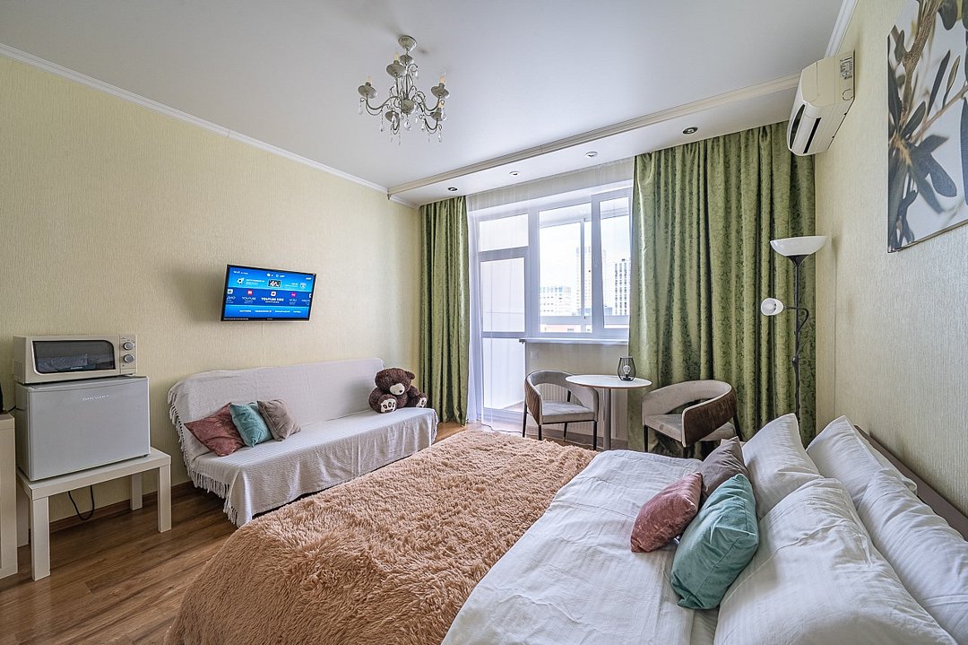 кабельное телевидение, интерактивное телевидение, Wi-Fi, кондиционер, светильник, фен, микроволновая печь, утюг, ванная комната, водонагреватель, теплый пол, банные полотенца, кровать «Queen size», гипоаллергенное белье, гладильная доска, стулья, шкаф для одежды, зеркало, набор посуды, чайник, отопление, вид на город, вид во двор, ламинат, стаканы, столовые приборы, стол, туалетные средства, туалет, диван-кровать, раскладной диван, телевизор с плоским экраном, мини-холодильник, номер для некурящих, онлайн-регистрация до заезда, можно с питомцамиВ студии