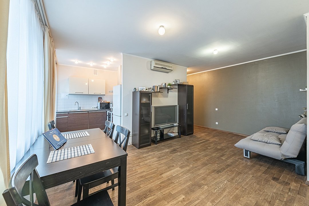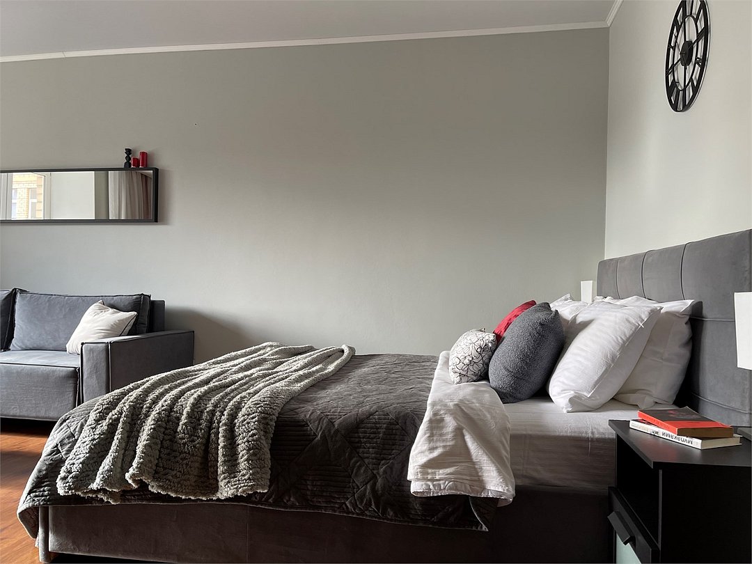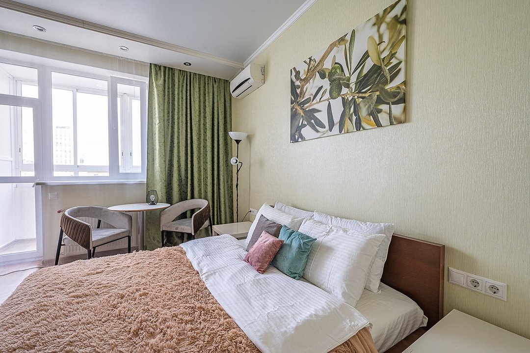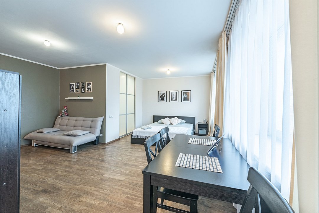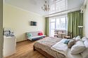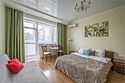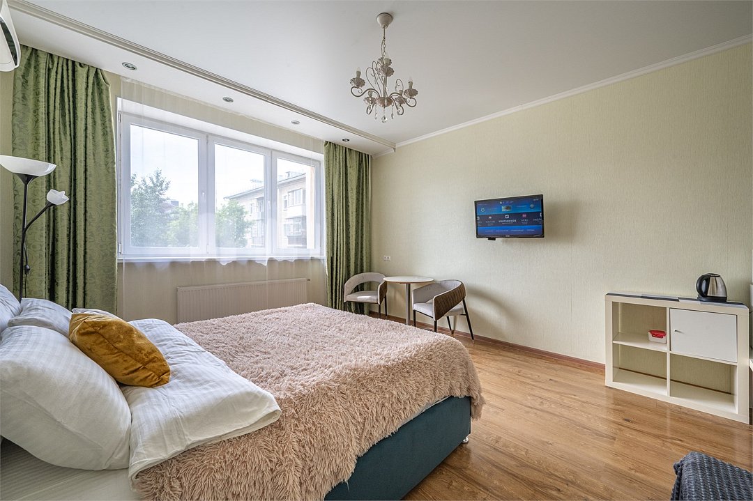 кабельное телевидение, интерактивное телевидение, Wi-Fi, кондиционер, светильник, фен, микроволновая печь, утюг, ванная комната, водонагреватель, теплый пол, банные полотенца, кровать «Queen size», гипоаллергенное белье, гладильная доска, стулья, шкаф для одежды, зеркало, набор посуды, чайник, отопление, вид на город, вид во двор, ламинат, стаканы, столовые приборы, стол, туалетные средства, туалет, диван-кровать, раскладной диван, телевизор с плоским экраном, мини-холодильник, номер для некурящих, онлайн-регистрация до заезда, можно с питомцамиВ студии