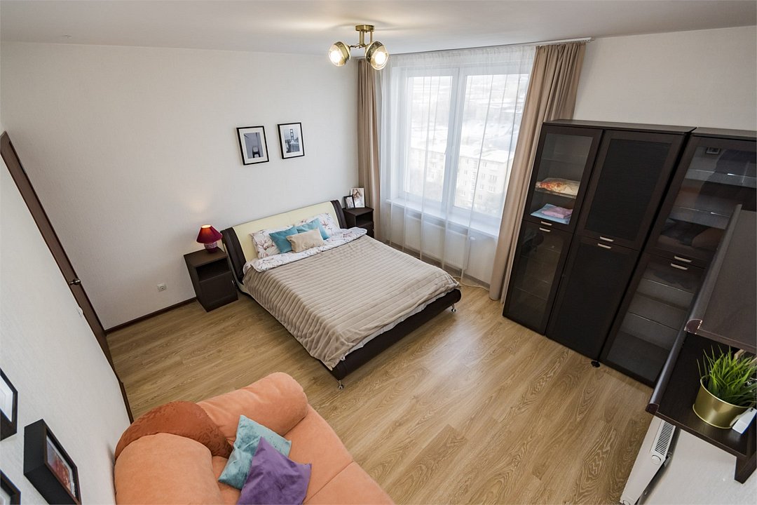 Апартаменты с двумя спальнями расположены на двадцать четвертом этаже жилого комплекса "Стрелки" в Железнодорожном районе Екатеринбурга. Две большие спальни, просторная гостиная- кухня, балкон и ванная комната. В пешем доступе Ж/д вокзал, Северный автовокзал, УРГУПС, Управление Дороги и набережная реки Исеть. Детская и спортивные площадки во дворе, охраняемая парковка(в трехстах метрах от дома) и консьерж сделают Ваше пребывание у нас комфортным и безопасным. Современный ремонт с участием дизайнера - декоратора позволяет почувствовать домашний уют каждому гостю. В наличии вся необходимая мебель и техника: - двуспальные кровати с ортопедическим основанием и удобным матрасом ; - большой раскладной диван; - шкаф-купе для одежды. Полноценная кухня, оснащена техникой, утварью и посудой, а именно: - плита; - микроволновая печь; - холодильник; - электрочайник; - бокалы под шампанское; - набор кастрюль и сковородок. Ванная комната оборудована ванной, раковиной, унитазом, стиральной машиной. Также для вашего удобства: - фен; - утюг ; - гладильная доска; - сушилка; - полотенца и постельное белье высокого качества. Для Вашего комфорта и развлечений всегда можно воспользоваться бесплатным WIFI и интерактивным ТВ. Кроме того, в наших апартаментах реализовано самостоятельное заселение, поэтому заселиться можно в любое удобное Вам время.Услуги и удобства