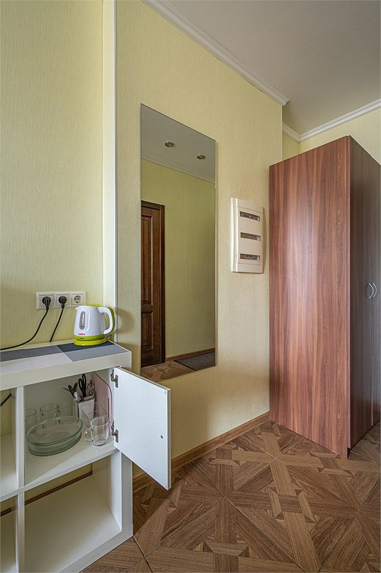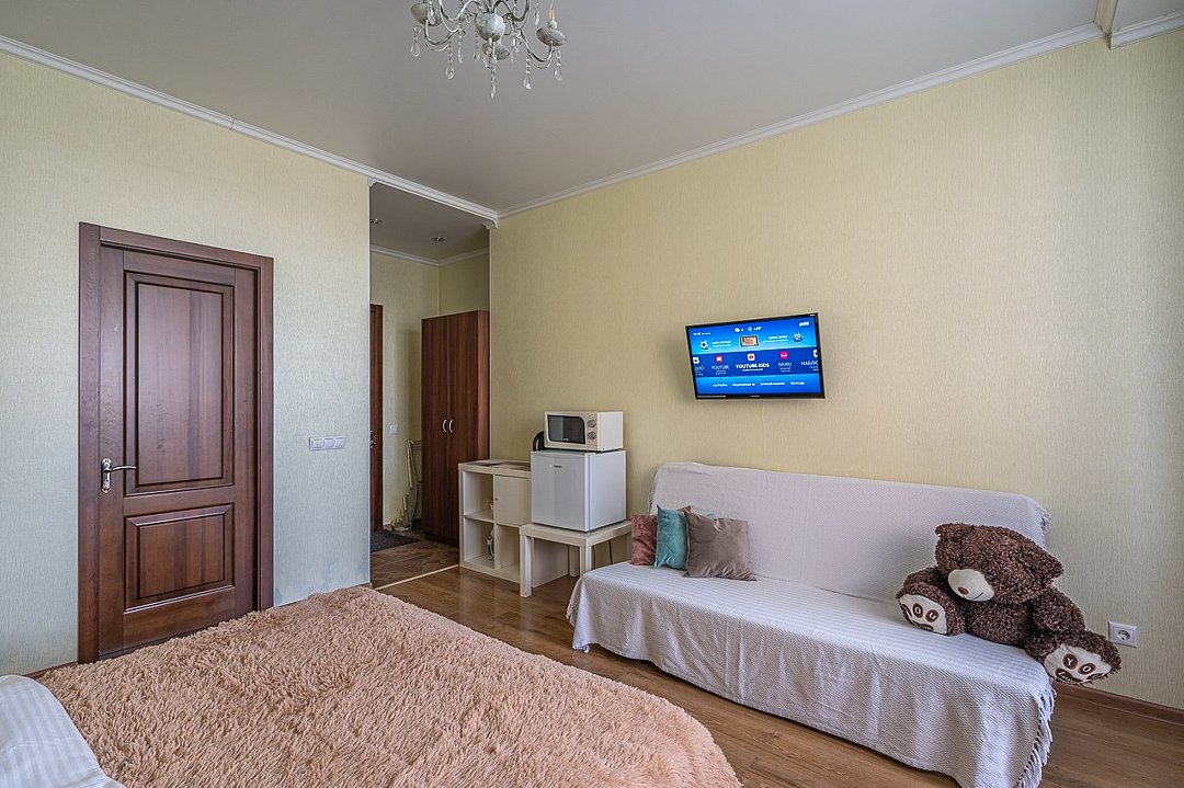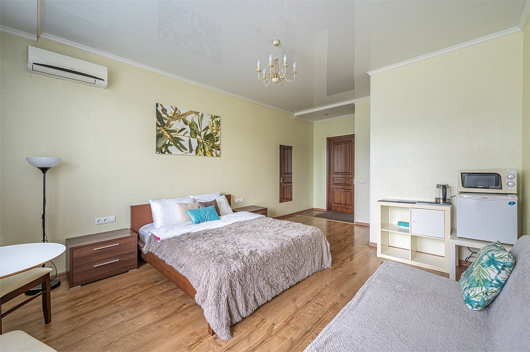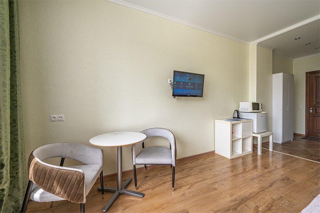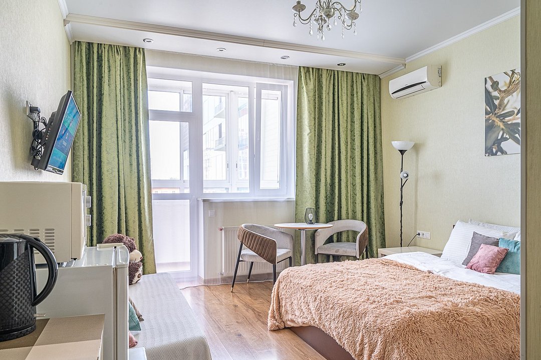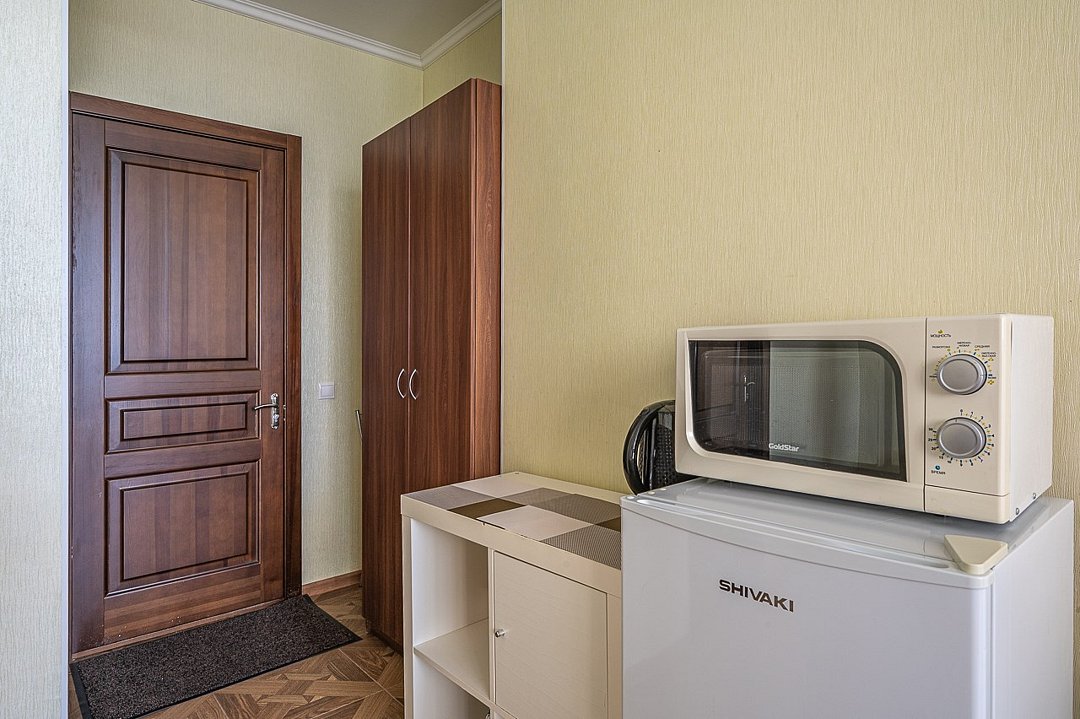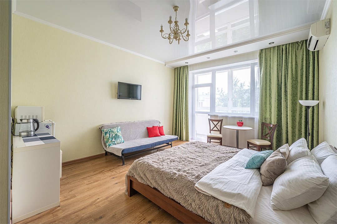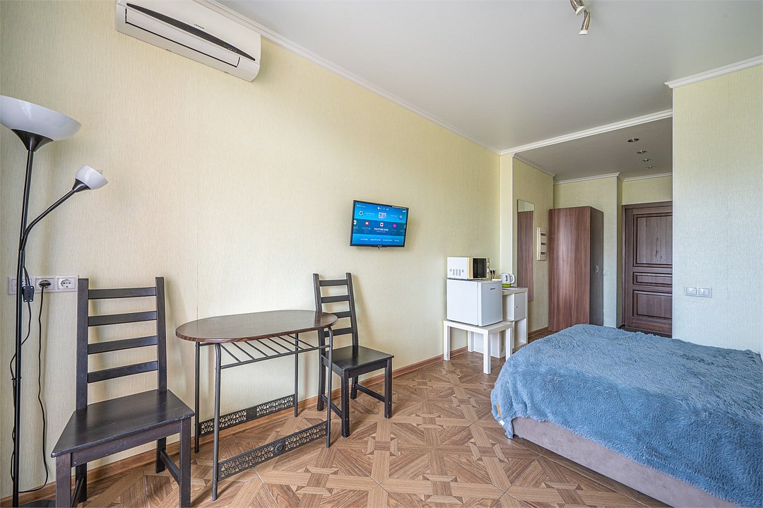 кабельное телевидение, интерактивное телевидение, Wi-Fi, холодильник, кондиционер, фен, микроволновая печь, утюг, обогреватель, ванная комната, водонагреватель, банные полотенца, балкон, двуспальная кровать, гипоаллергенное белье, гладильная доска, тумбы, стулья, шкаф для одежды, вешалки, зеркало, набор посуды, обслуживание номеров, чайник, унитаз, раковина, отопление, душ, вид во двор, ламинат, стаканы, столовые приборы, стул, стол, туалетные средства, цифровое тв, диван-кровать, раскладной диван, телевизор с плоским экраном, мини-холодильник, номер для некурящих, онлайн-регистрация до заезда, можно с питомцамиВ студии