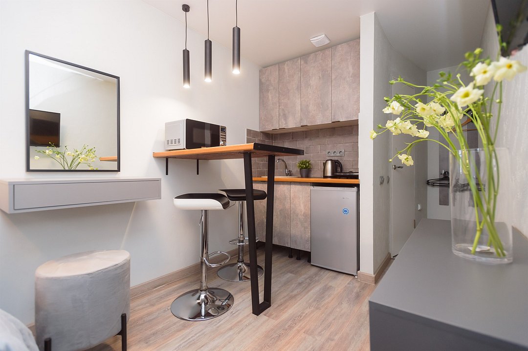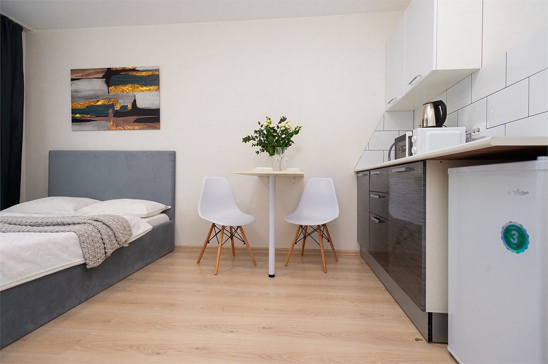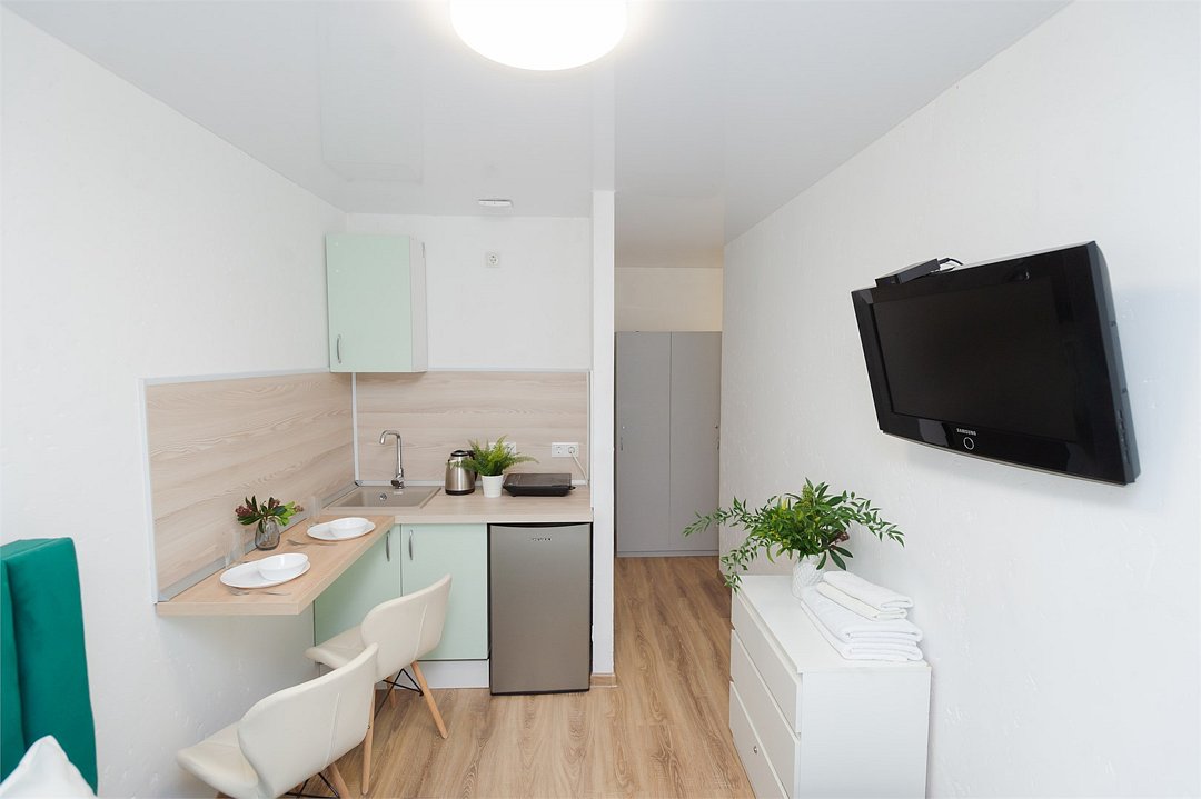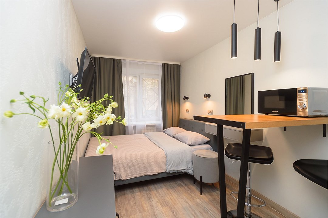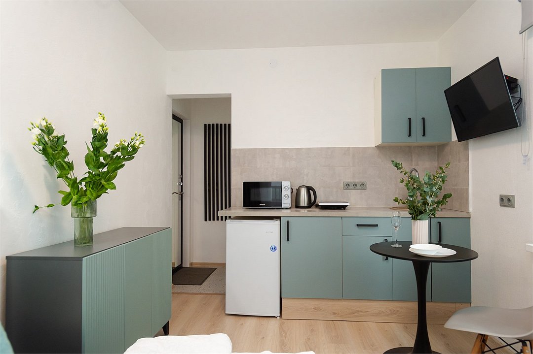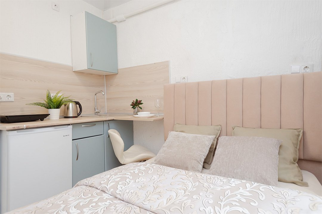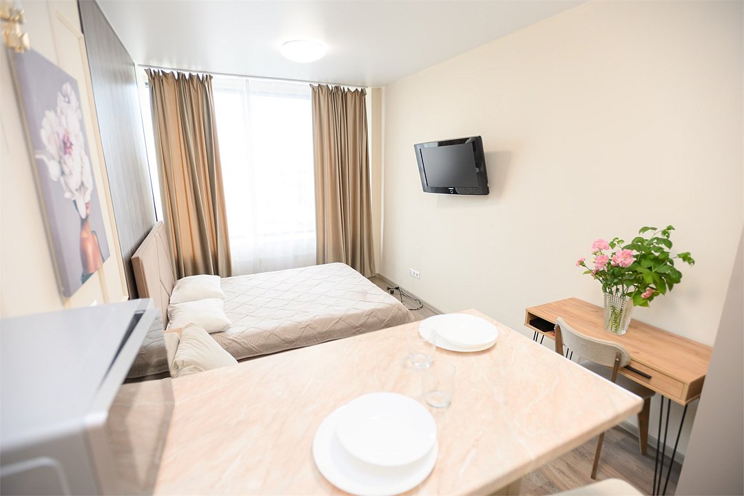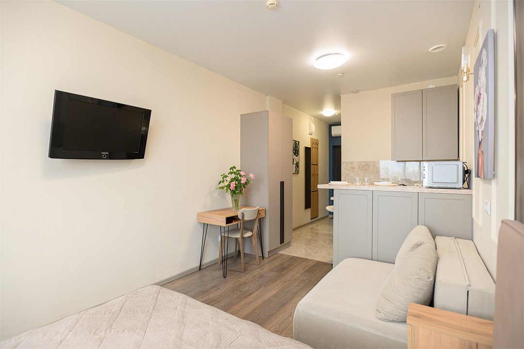 телевизор, кабельное телевидение, Wi-Fi, светильник, фен, плита для приготовления пищи, микроволновая печь, утюг, санузел, банные полотенца, гигиенические средства, балкон, двуспальная кровать, гладильная доска, стулья, вешалки, зеркало, набор посуды, стиральная машина, чайник, раковина, отопление, душ, вид во двор, кухонная посуда, столовые приборы, тумба, туалетные средства, туалет, сушилка для белья, мини-холодильник, кухонный уголок, номер для некурящих, набор для приготовления чая и кофе, без питомцевВ студии