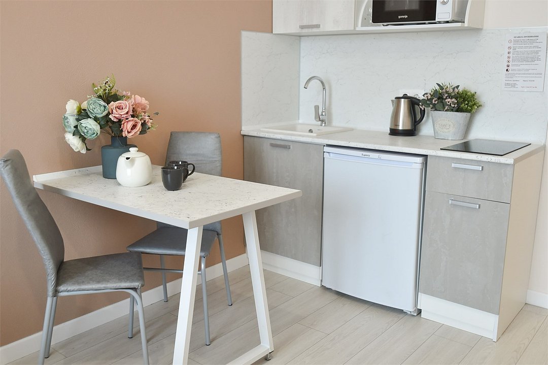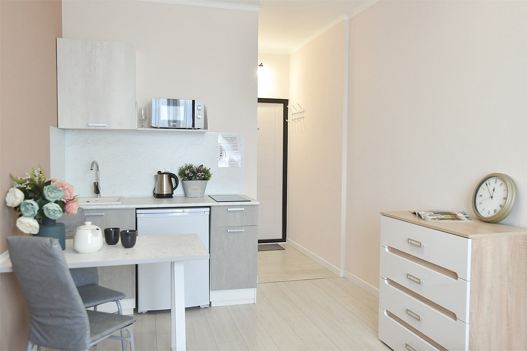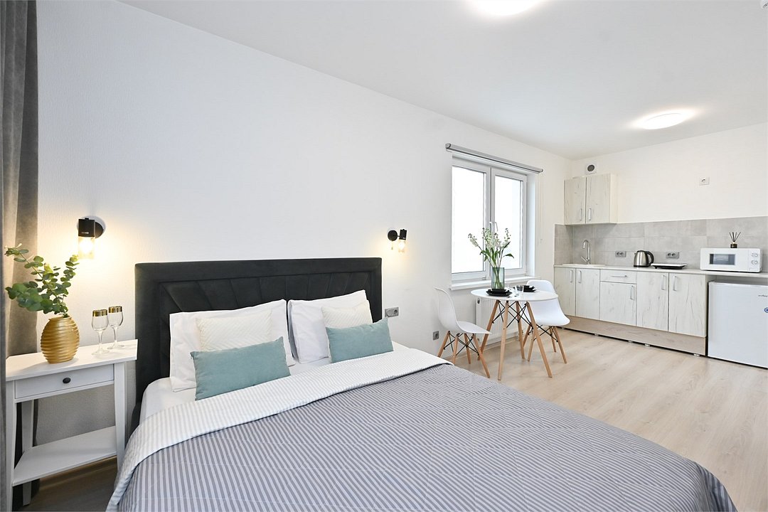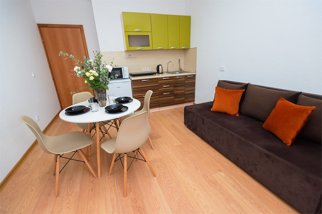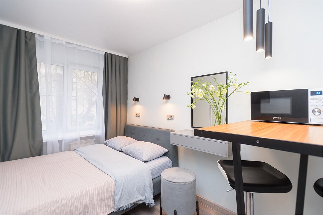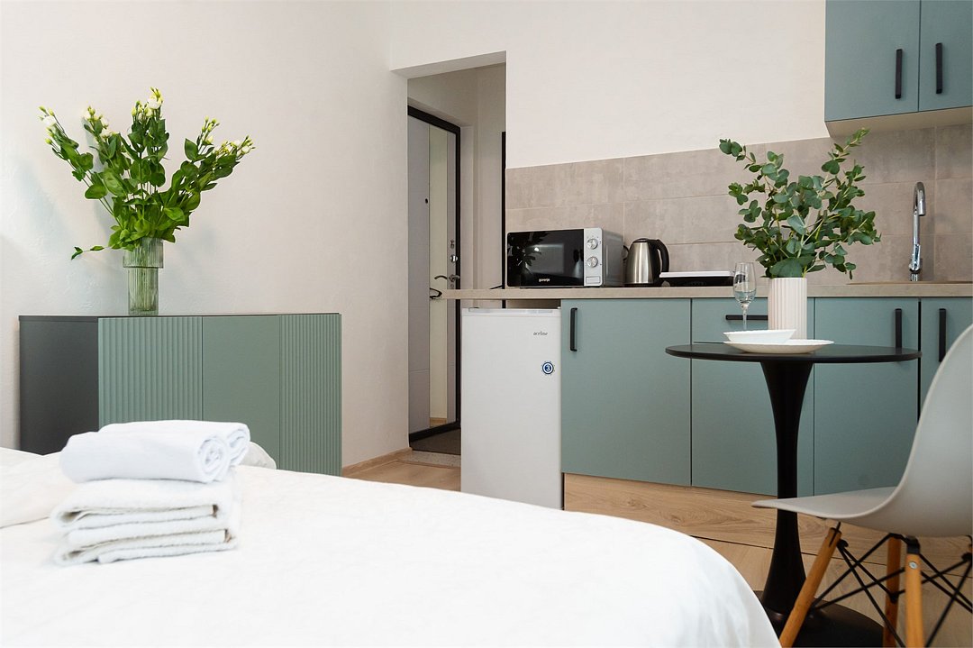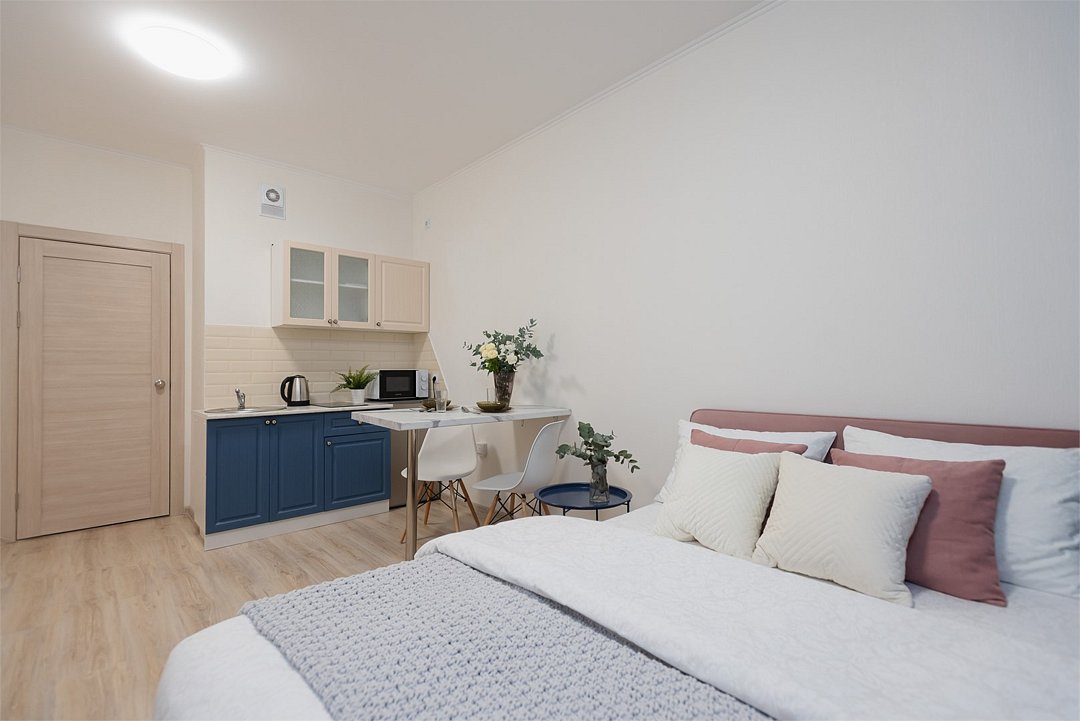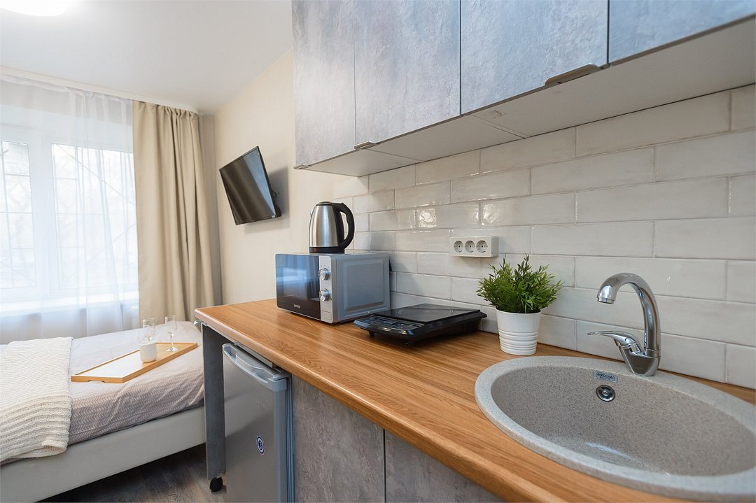 телевизор, кабельное телевидение, Wi-Fi, светильник, фен, плита для приготовления пищи, микроволновая печь, утюг, санузел, банные полотенца, гигиенические средства, балкон, двуспальная кровать, гладильная доска, стулья, вешалки, зеркало, набор посуды, стиральная машина, чайник, раковина, отопление, душ, вид во двор, кухонная посуда, столовые приборы, тумба, туалетные средства, туалет, сушилка для белья, мини-холодильник, кухонный уголок, номер для некурящих, набор для приготовления чая и кофе, без питомцевВ студии