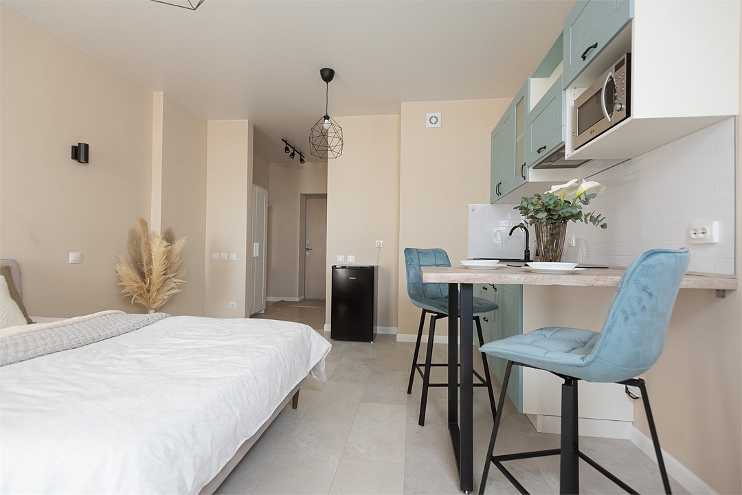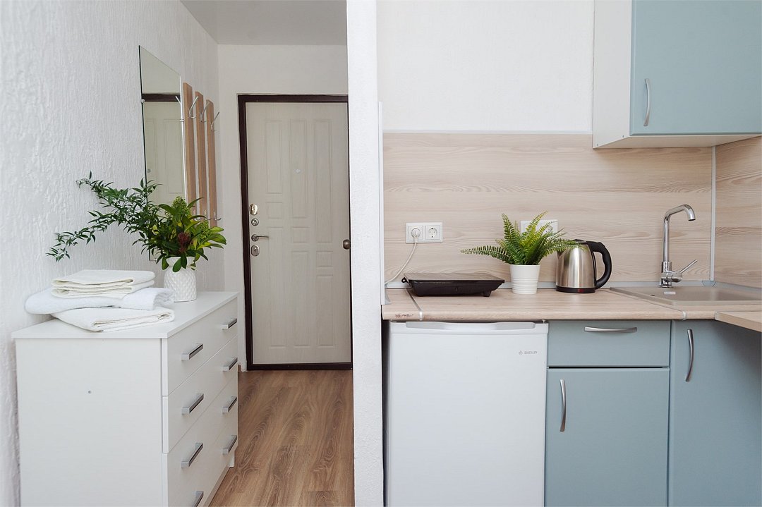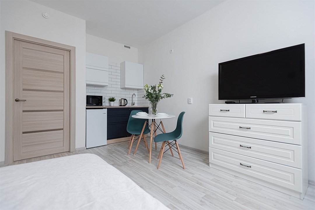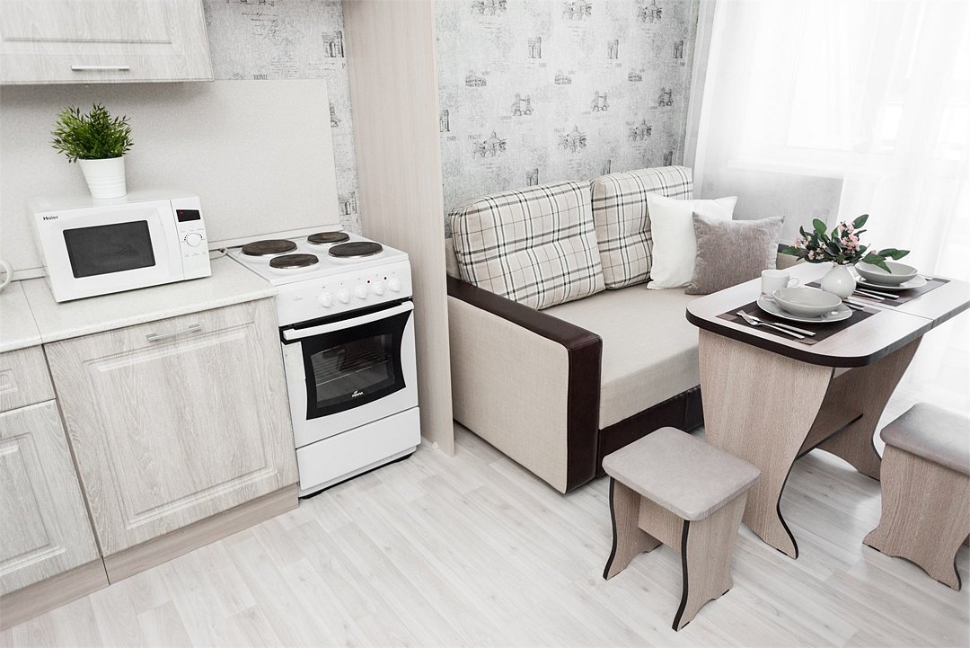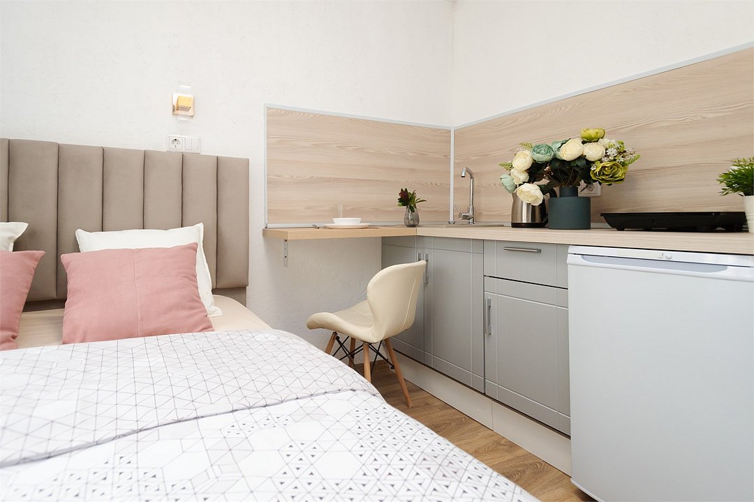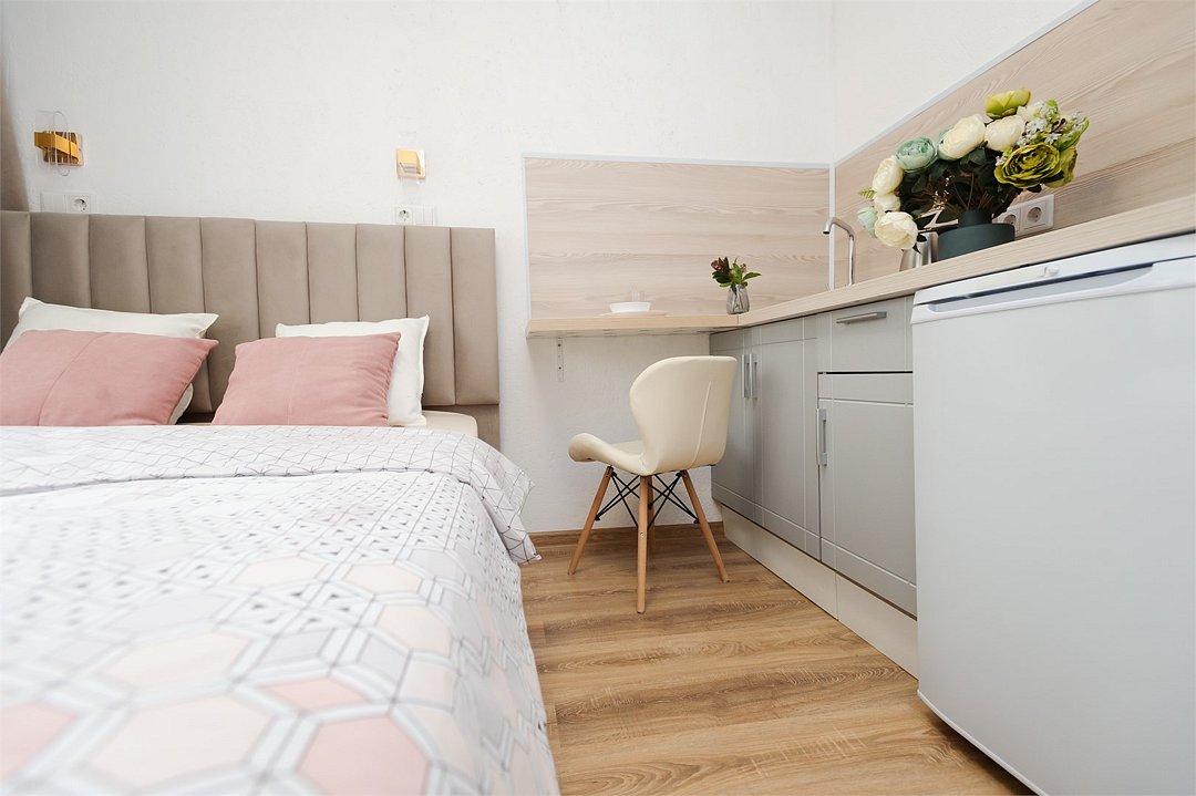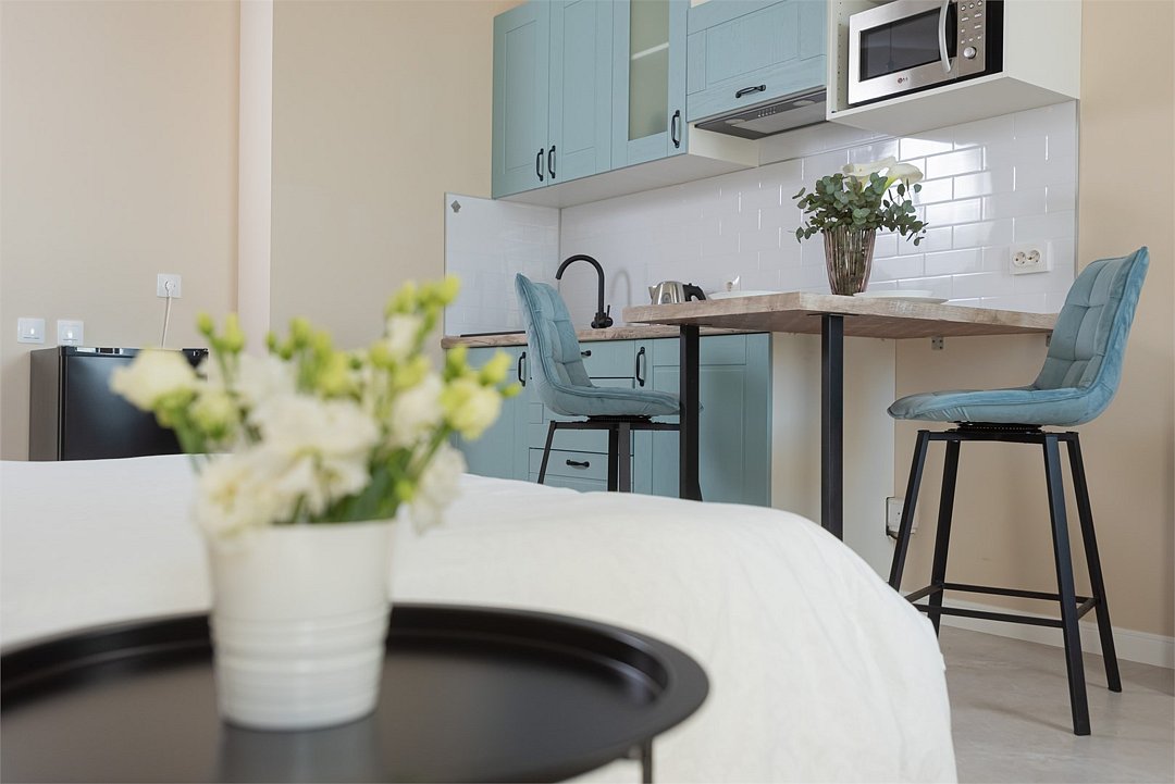 телевизор, кабельное телевидение, Wi-Fi, светильник, фен, плита для приготовления пищи, микроволновая печь, утюг, санузел, банные полотенца, гигиенические средства, балкон, двуспальная кровать, гладильная доска, стулья, вешалки, зеркало, набор посуды, стиральная машина, чайник, раковина, отопление, душ, вид во двор, кухонная посуда, столовые приборы, тумба, туалетные средства, туалет, сушилка для белья, мини-холодильник, кухонный уголок, номер для некурящих, набор для приготовления чая и кофе, без питомцевВ студии