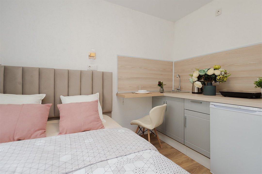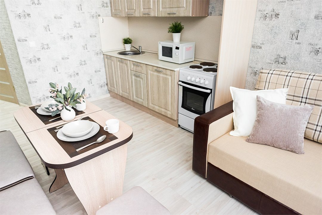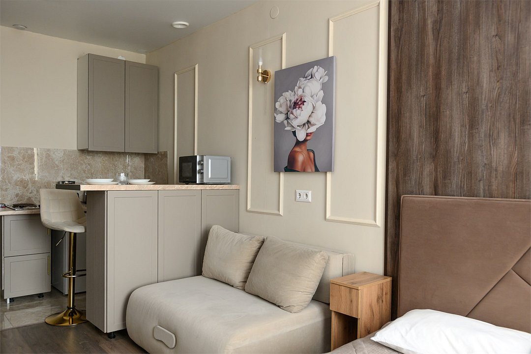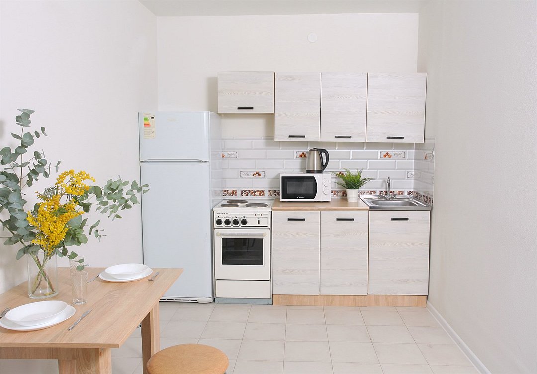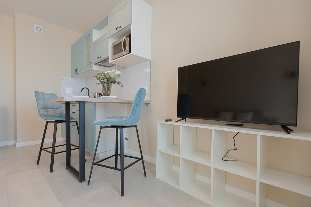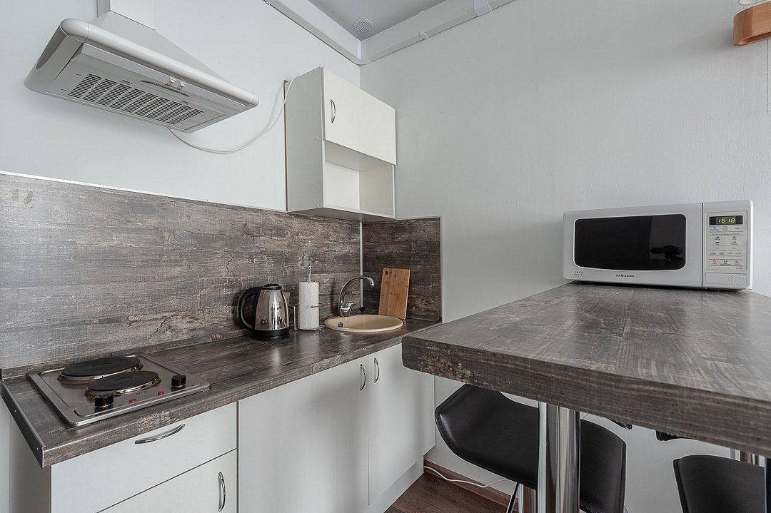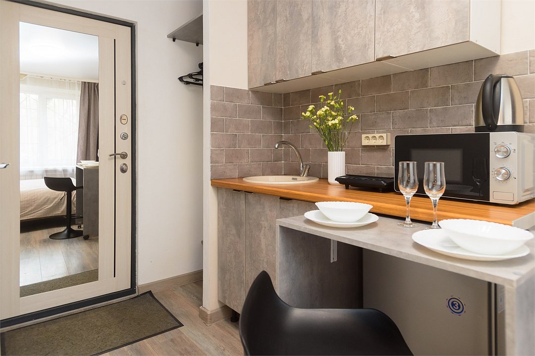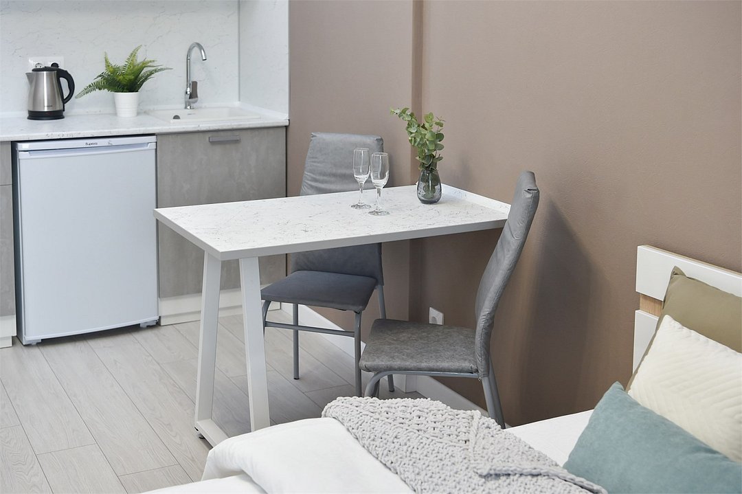 телевизор, кабельное телевидение, Wi-Fi, светильник, фен, плита для приготовления пищи, микроволновая печь, утюг, санузел, банные полотенца, гигиенические средства, балкон, двуспальная кровать, гладильная доска, стулья, вешалки, зеркало, набор посуды, стиральная машина, чайник, раковина, отопление, душ, вид во двор, кухонная посуда, столовые приборы, тумба, туалетные средства, туалет, сушилка для белья, мини-холодильник, кухонный уголок, номер для некурящих, набор для приготовления чая и кофе, без питомцевВ студии