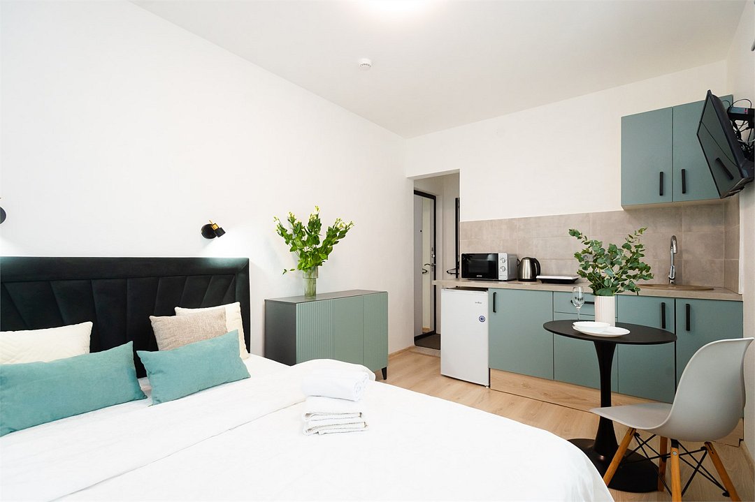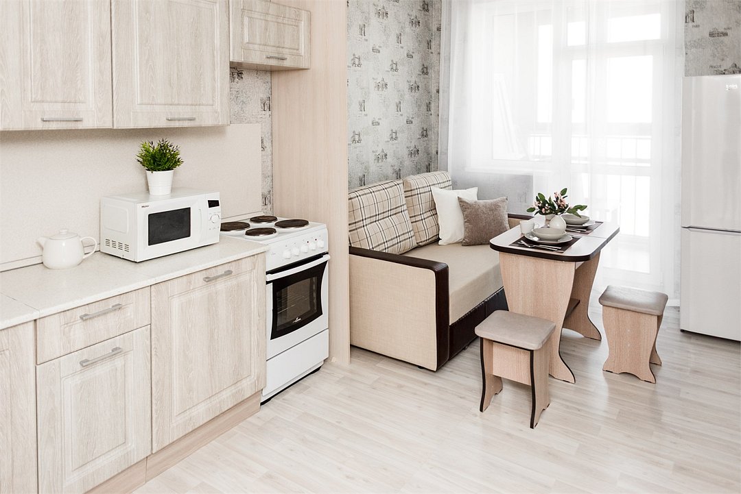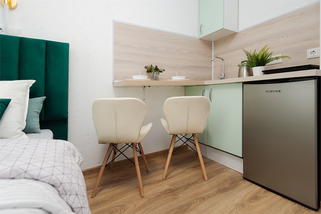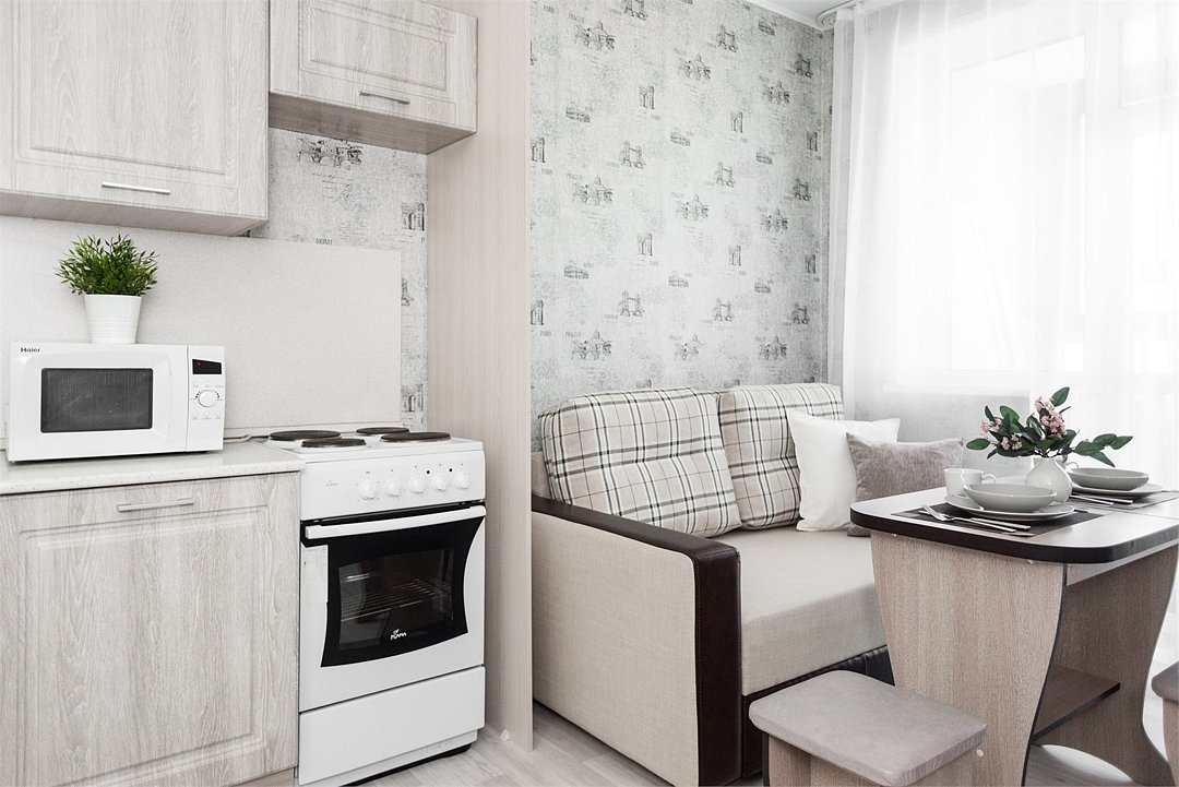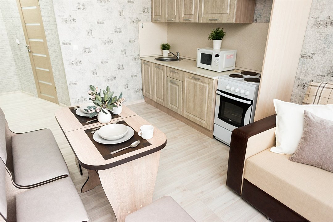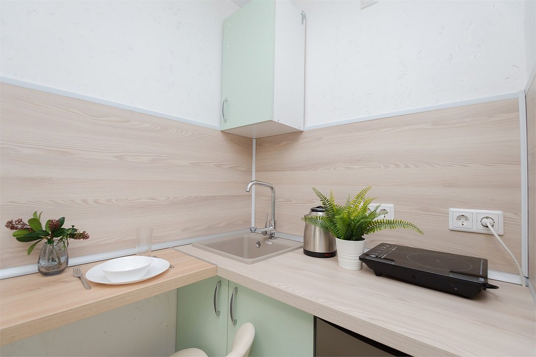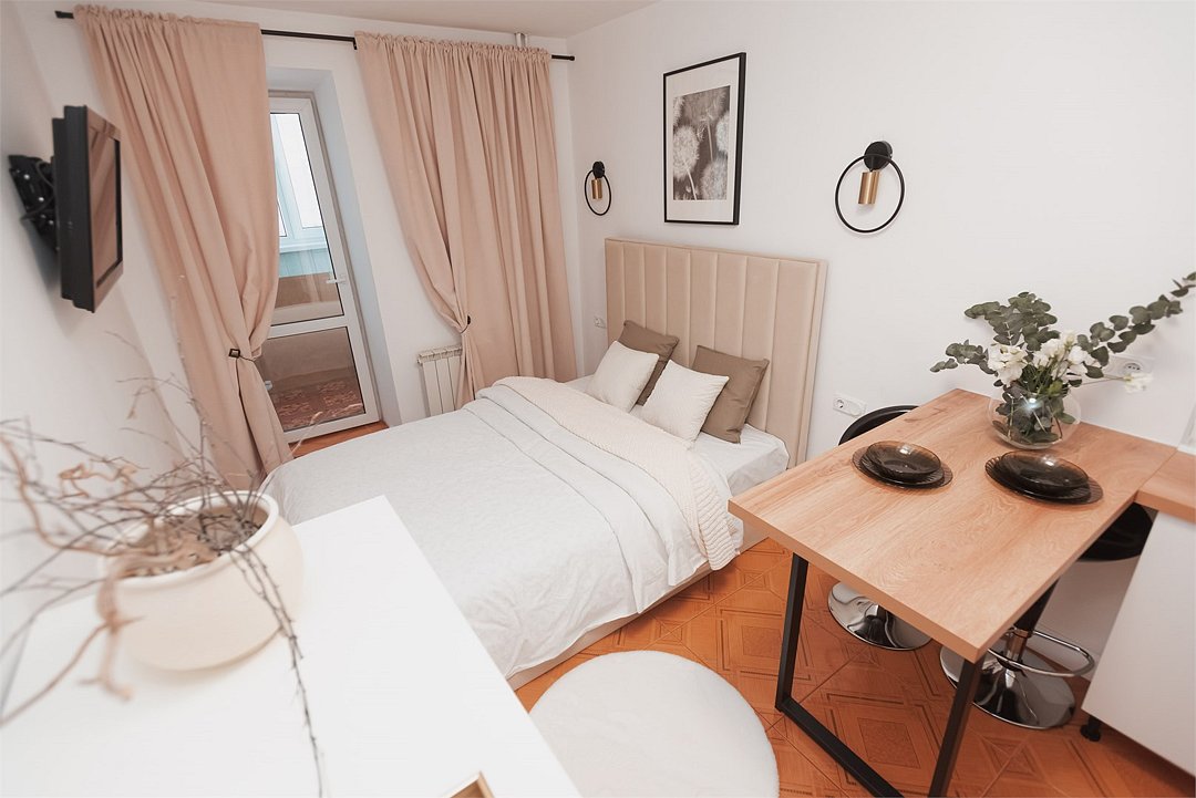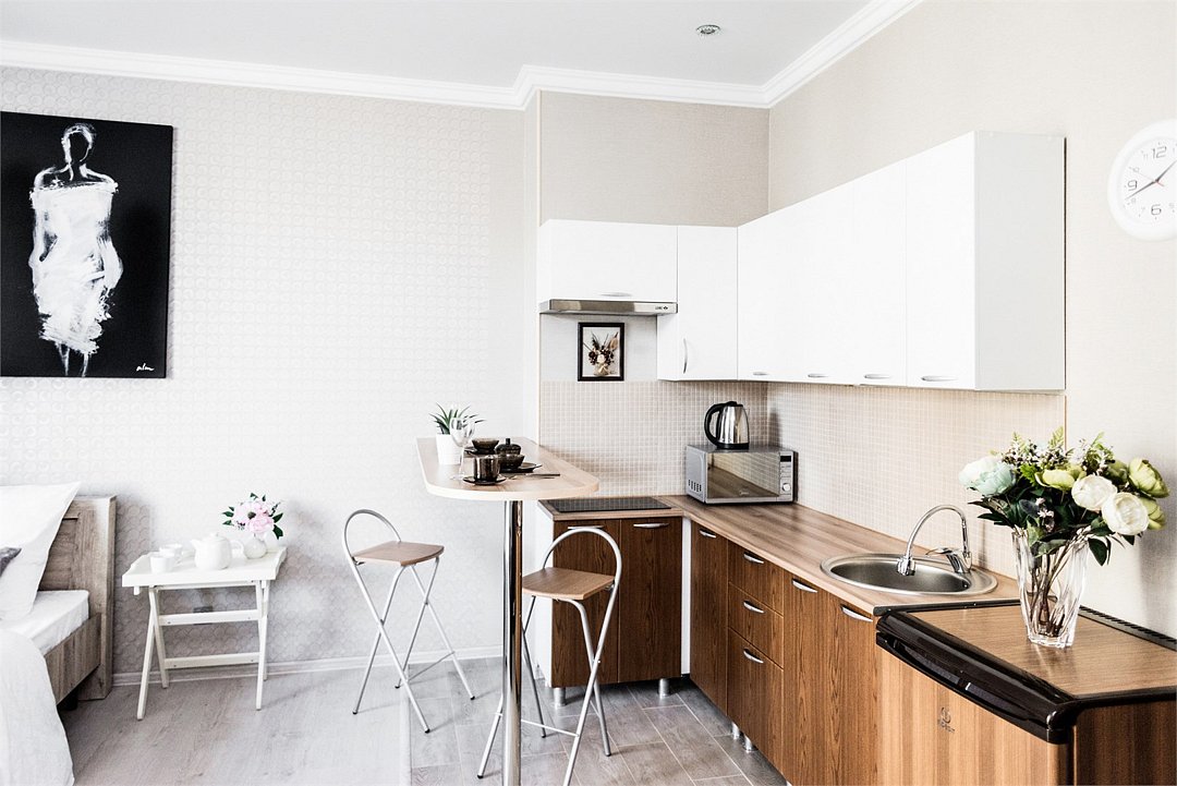 телевизор, кабельное телевидение, Wi-Fi, светильник, фен, плита для приготовления пищи, микроволновая печь, утюг, санузел, банные полотенца, гигиенические средства, балкон, двуспальная кровать, гладильная доска, стулья, вешалки, зеркало, набор посуды, стиральная машина, чайник, раковина, отопление, душ, вид во двор, кухонная посуда, столовые приборы, тумба, туалетные средства, туалет, сушилка для белья, мини-холодильник, кухонный уголок, номер для некурящих, набор для приготовления чая и кофе, без питомцевВ студии