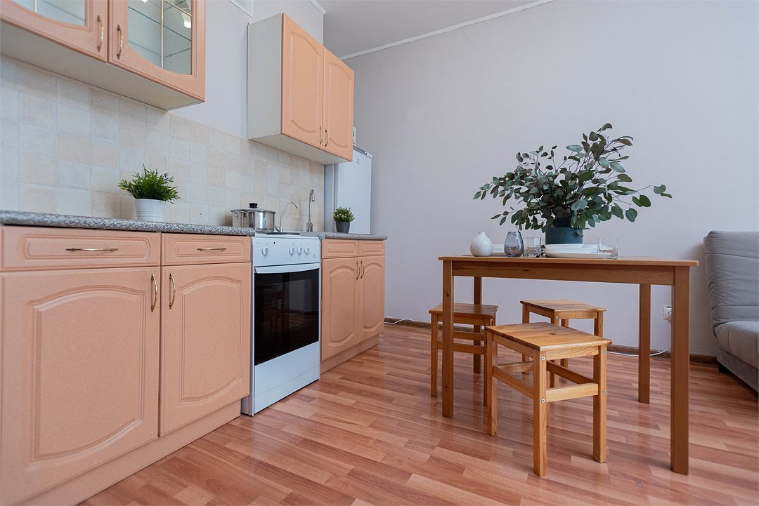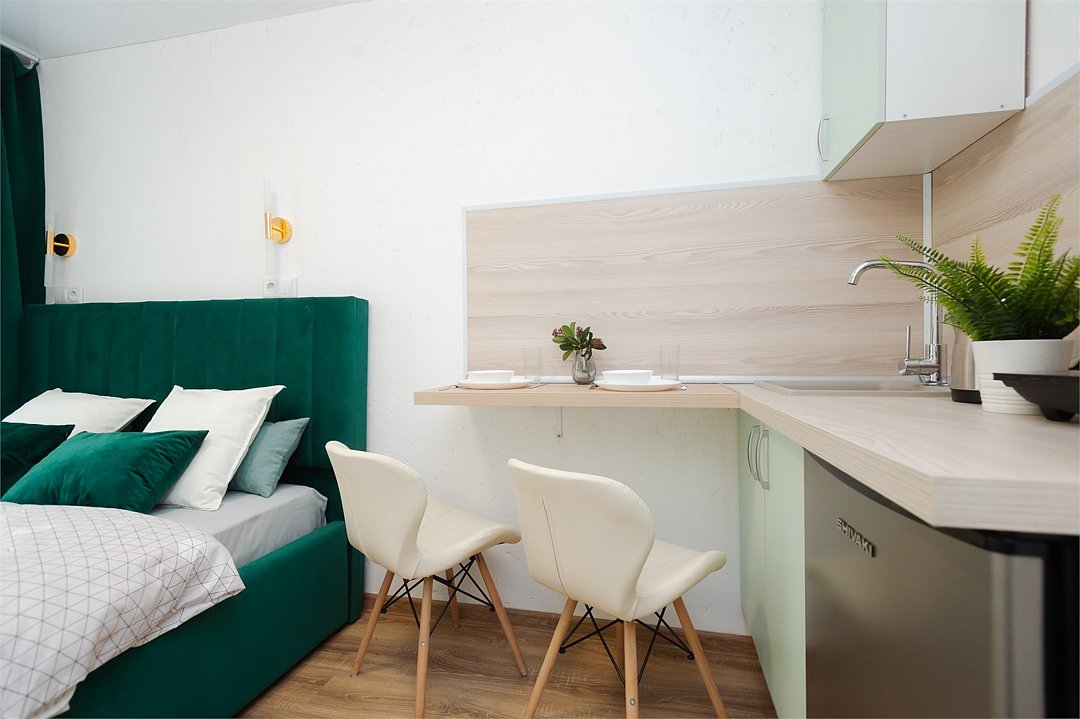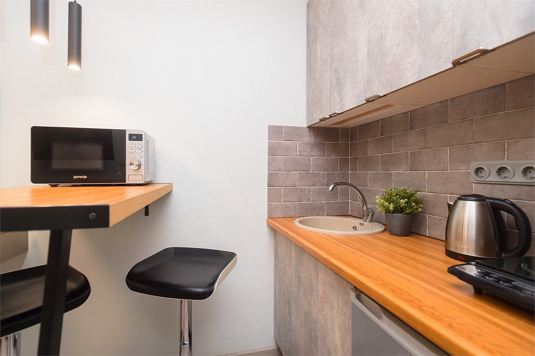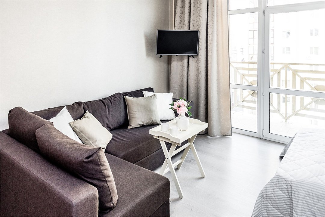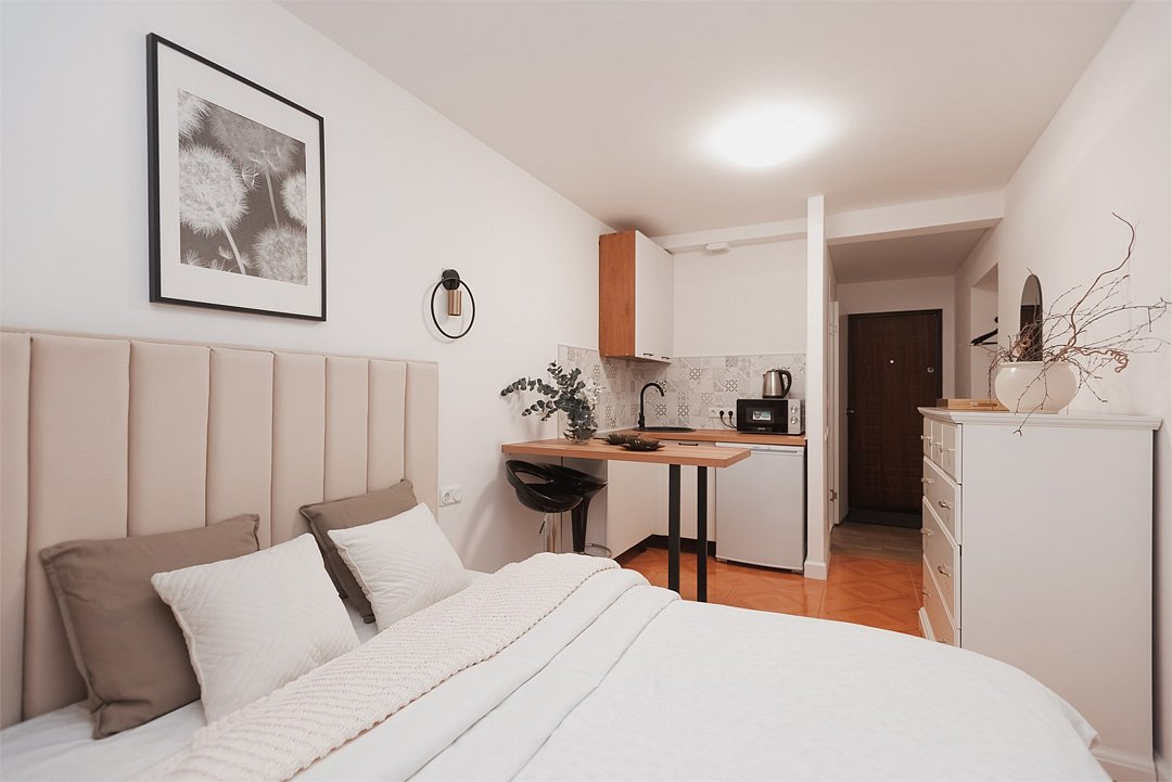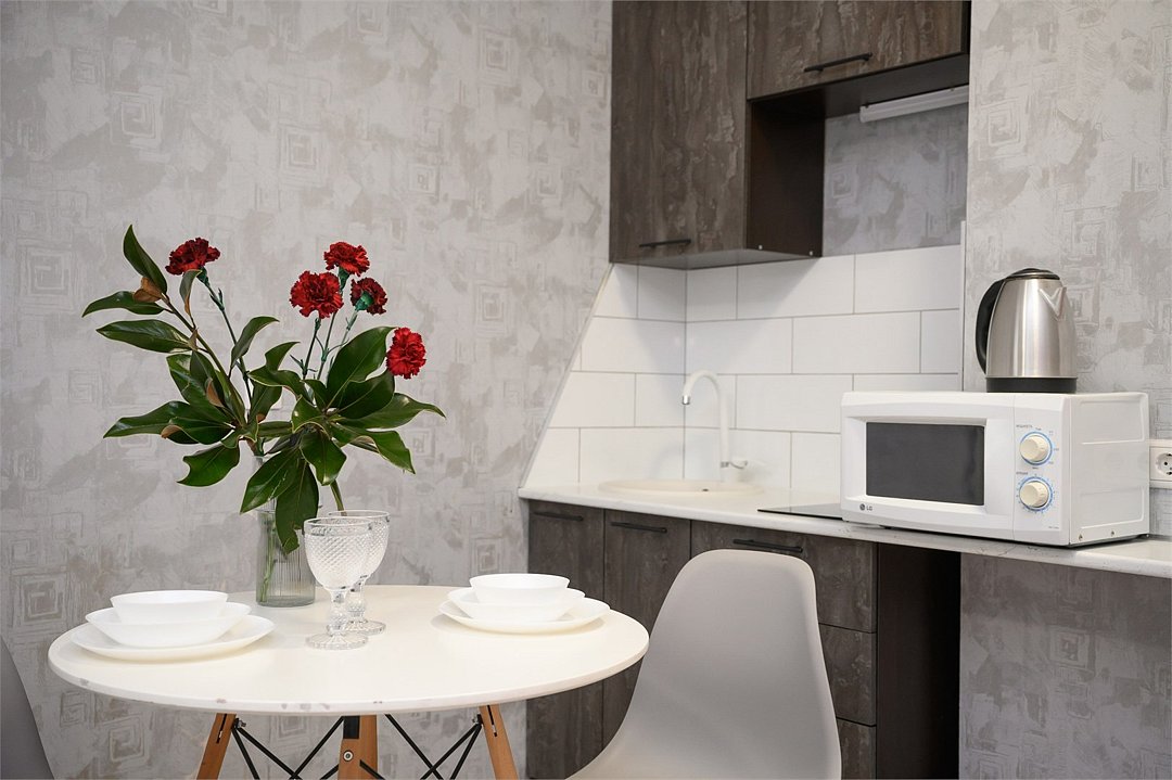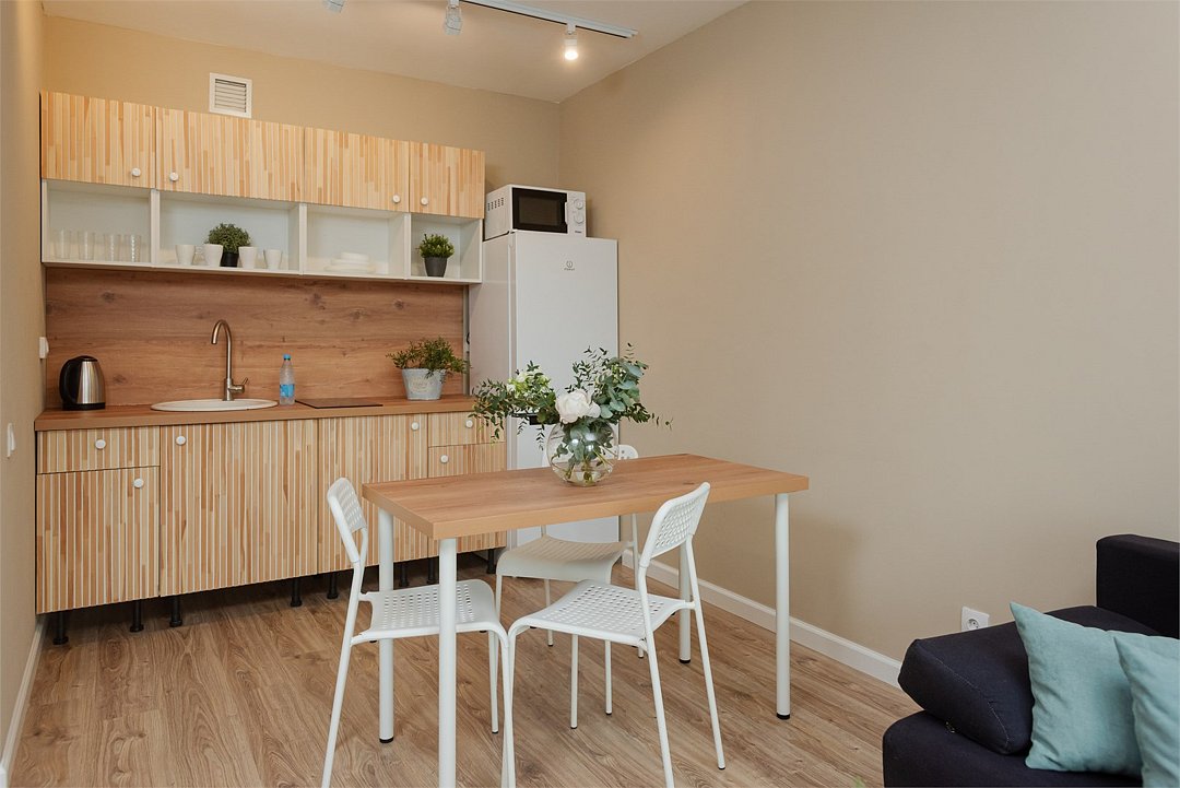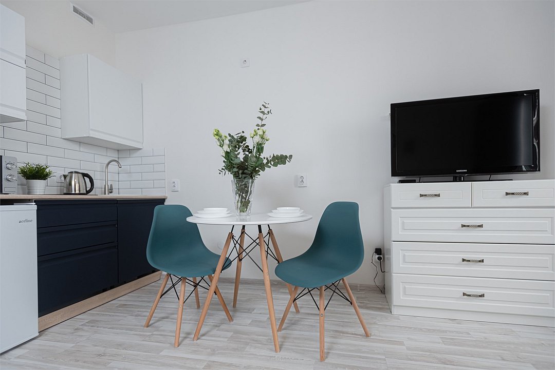 телевизор, кабельное телевидение, Wi-Fi, светильник, фен, плита для приготовления пищи, микроволновая печь, утюг, санузел, банные полотенца, гигиенические средства, балкон, двуспальная кровать, гладильная доска, стулья, вешалки, зеркало, набор посуды, стиральная машина, чайник, раковина, отопление, душ, вид во двор, кухонная посуда, столовые приборы, тумба, туалетные средства, туалет, сушилка для белья, мини-холодильник, кухонный уголок, номер для некурящих, набор для приготовления чая и кофе, без питомцевВ студии