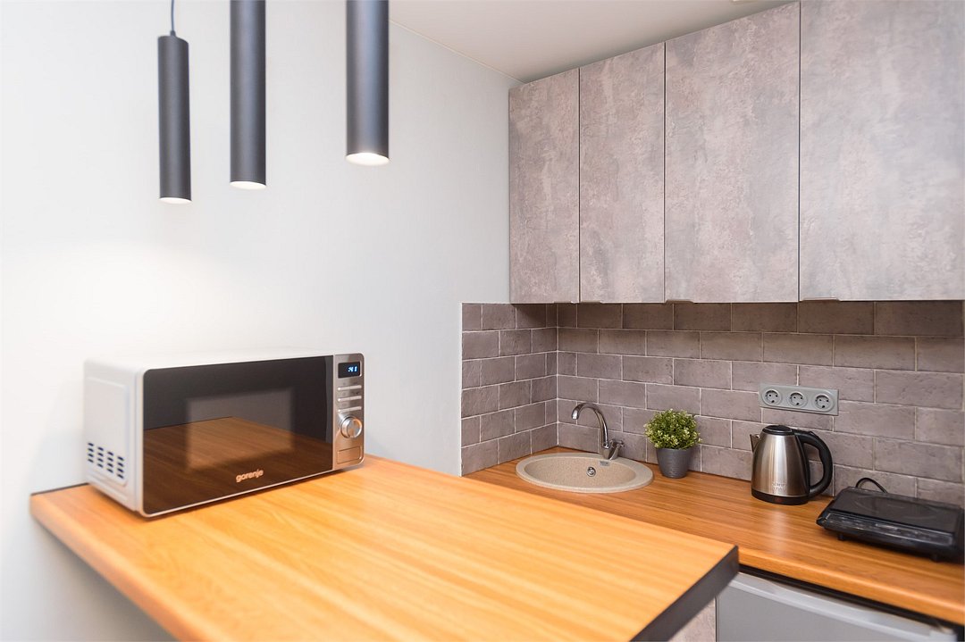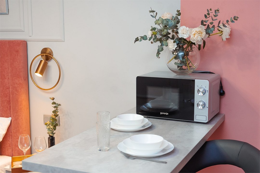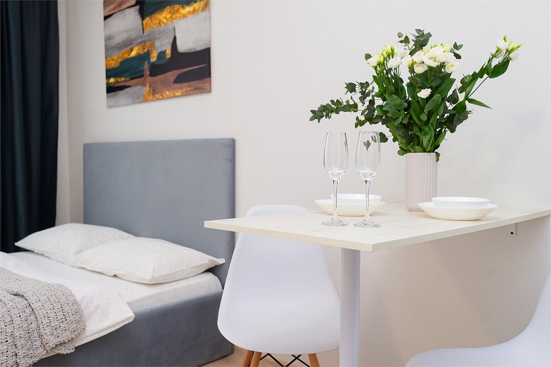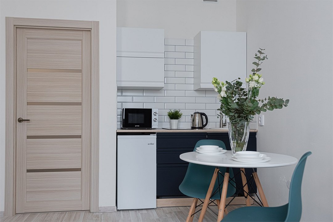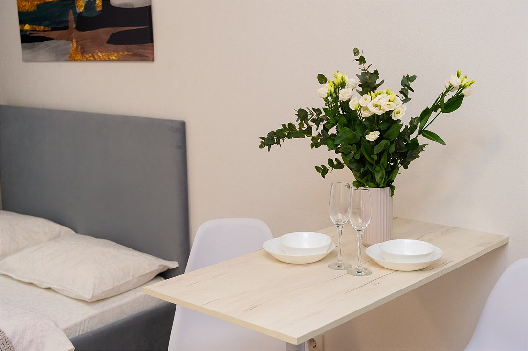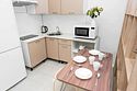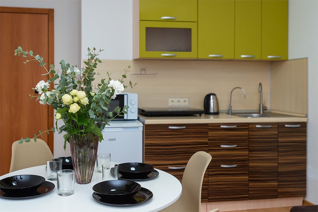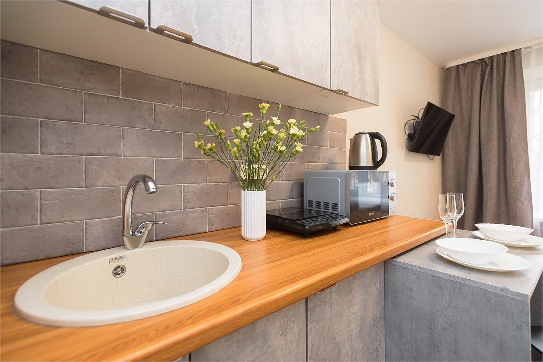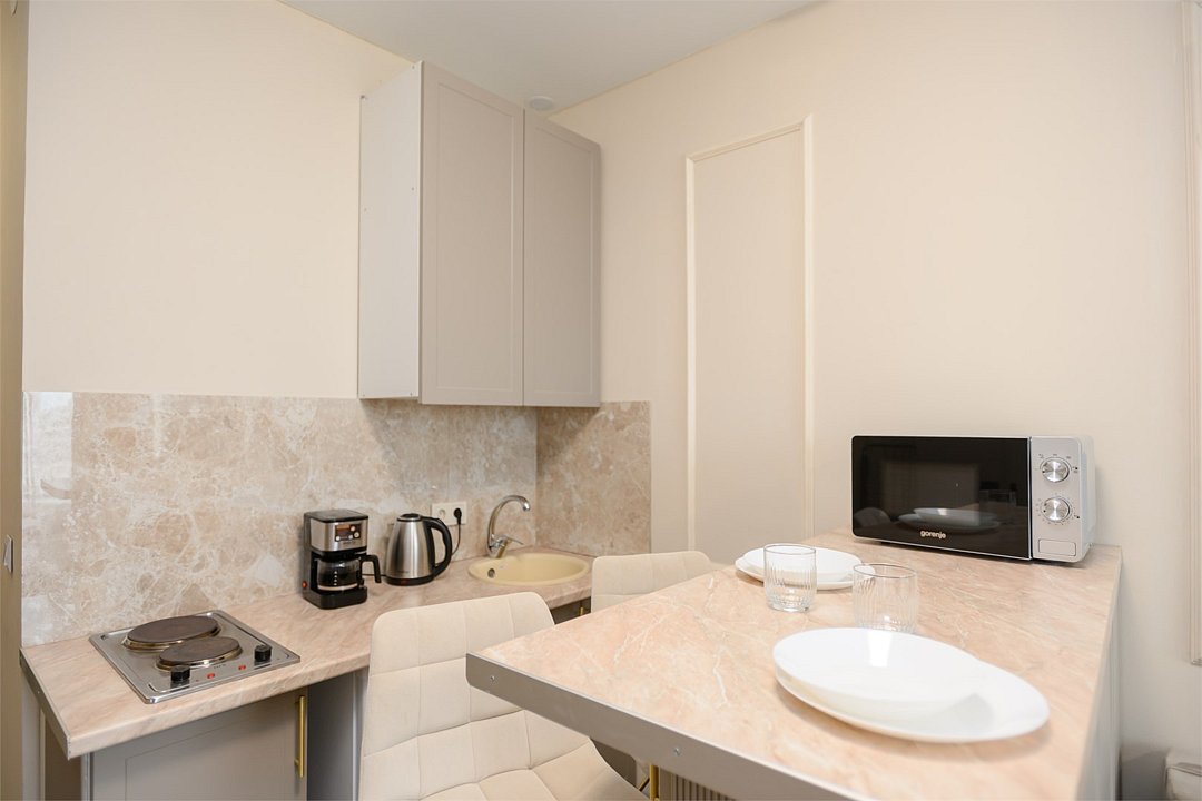телевизор, кабельное телевидение, Wi-Fi, светильник, фен, плита для приготовления пищи, микроволновая печь, утюг, санузел, банные полотенца, гигиенические средства, балкон, двуспальная кровать, гладильная доска, стулья, вешалки, зеркало, набор посуды, стиральная машина, чайник, раковина, отопление, душ, вид во двор, кухонная посуда, столовые приборы, тумба, туалетные средства, туалет, сушилка для белья, мини-холодильник, кухонный уголок, номер для некурящих, набор для приготовления чая и кофе, без питомцевВ студии