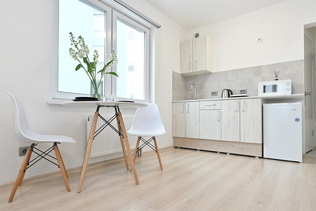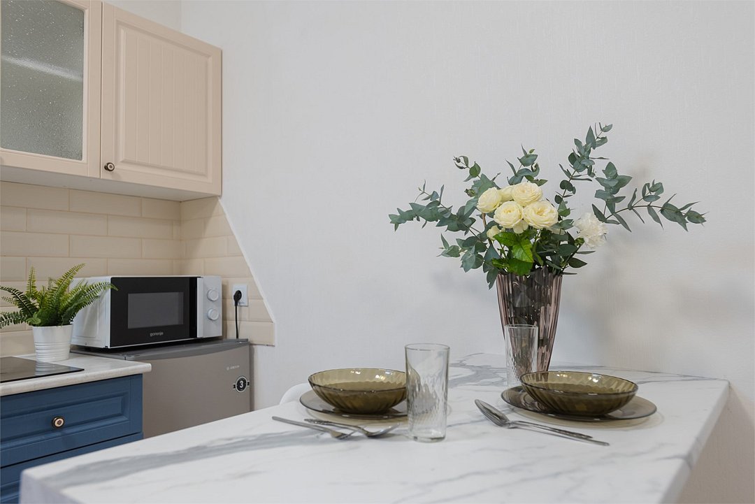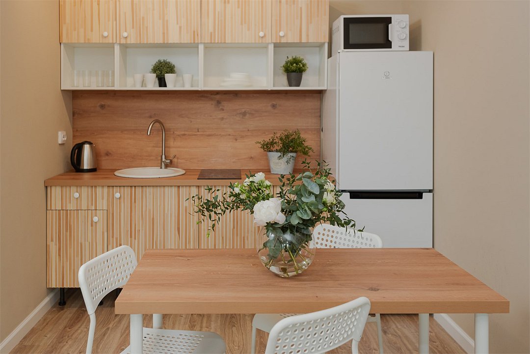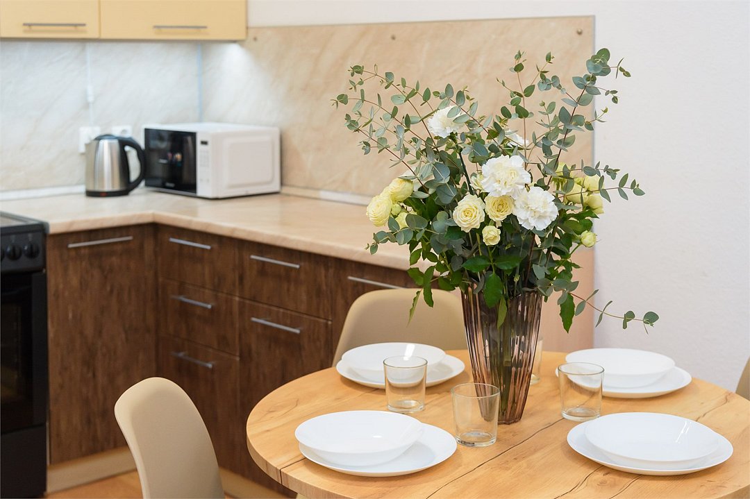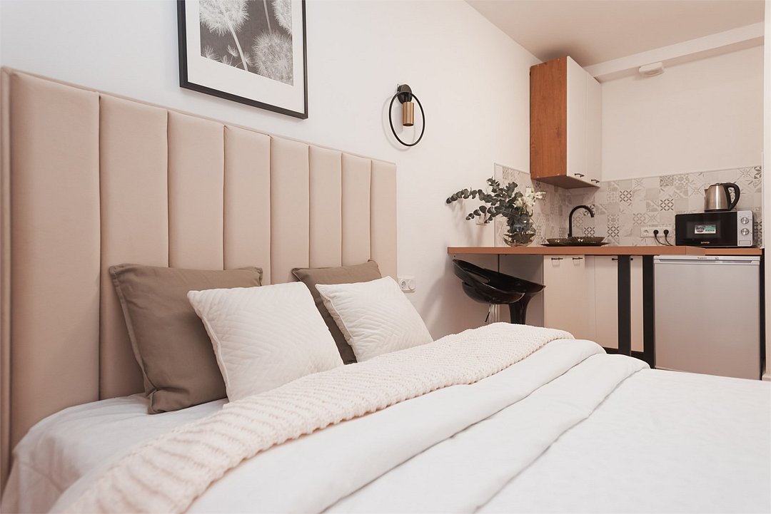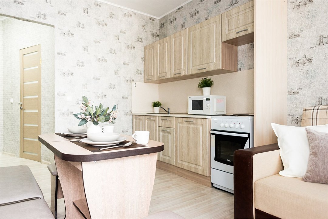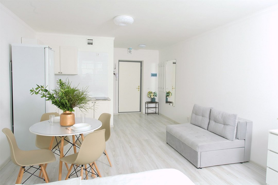 телевизор, кабельное телевидение, Wi-Fi, светильник, фен, плита для приготовления пищи, микроволновая печь, утюг, санузел, банные полотенца, гигиенические средства, балкон, двуспальная кровать, гладильная доска, стулья, вешалки, зеркало, набор посуды, стиральная машина, чайник, раковина, отопление, душ, вид во двор, кухонная посуда, столовые приборы, тумба, туалетные средства, туалет, сушилка для белья, мини-холодильник, кухонный уголок, номер для некурящих, набор для приготовления чая и кофе, без питомцевВ студии