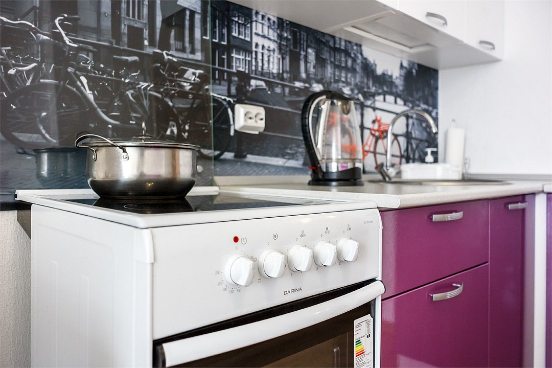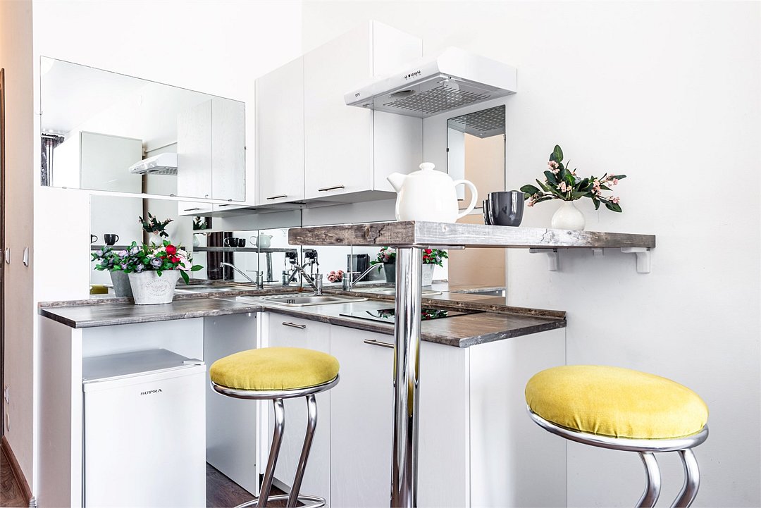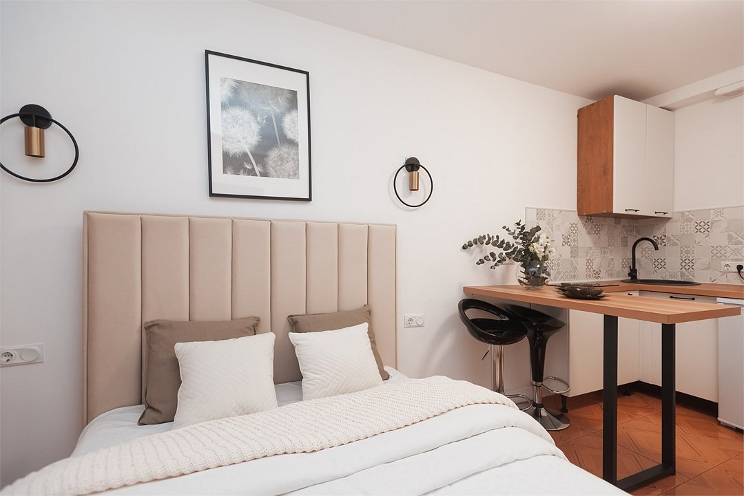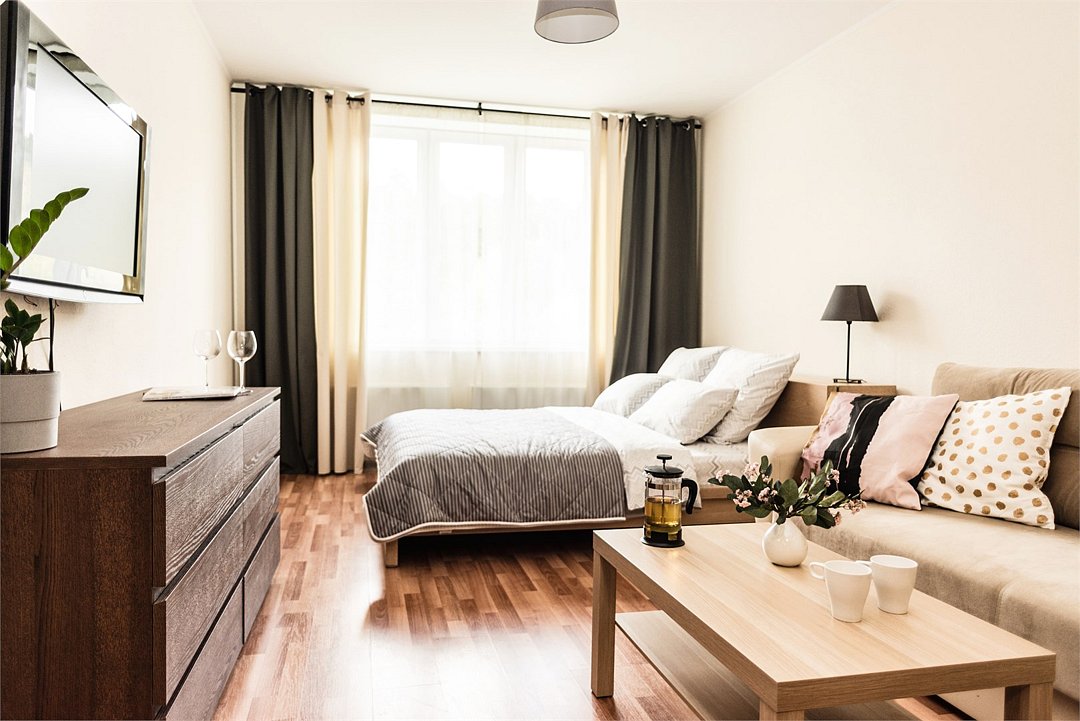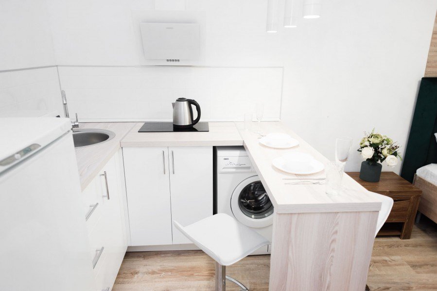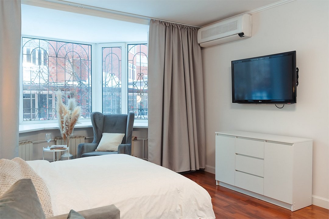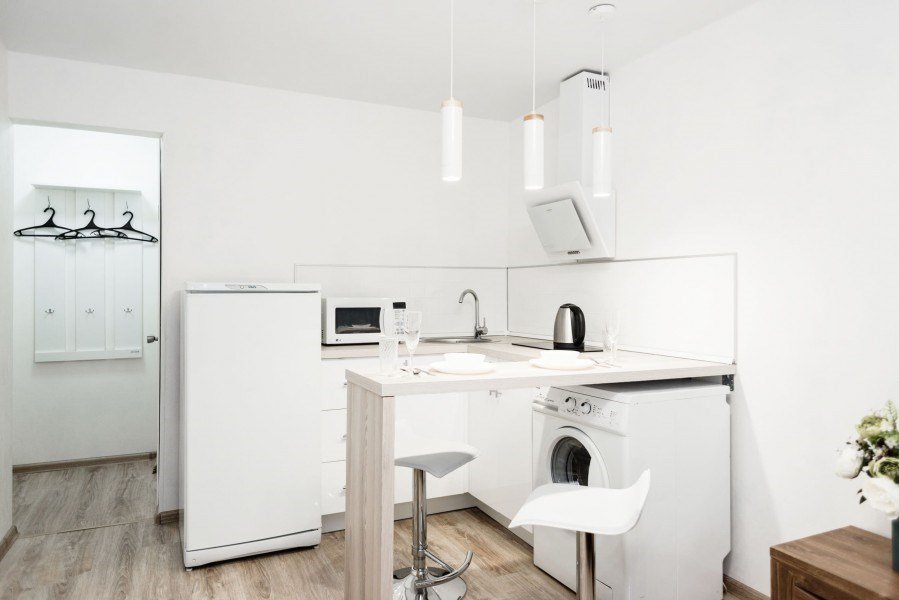 кабельное телевидение, Wi-Fi, фен, плита для приготовления пищи, микроволновая печь, утюг, санузел, банные полотенца, гигиенические средства, двуспальная кровать, гладильная доска, стулья, вешалки, барная стойка, зеркало, комод, набор посуды, стиральная машина, чайник, раковина, отопление, душ, вид на город, вид во двор, кухонная посуда, столовые приборы, туалетные средства, сушилка для белья, телевизор с плоским экраном, мини-холодильник, кухонный уголок, номер для некурящих, набор для приготовления чая и кофе, без питомцевВ студии