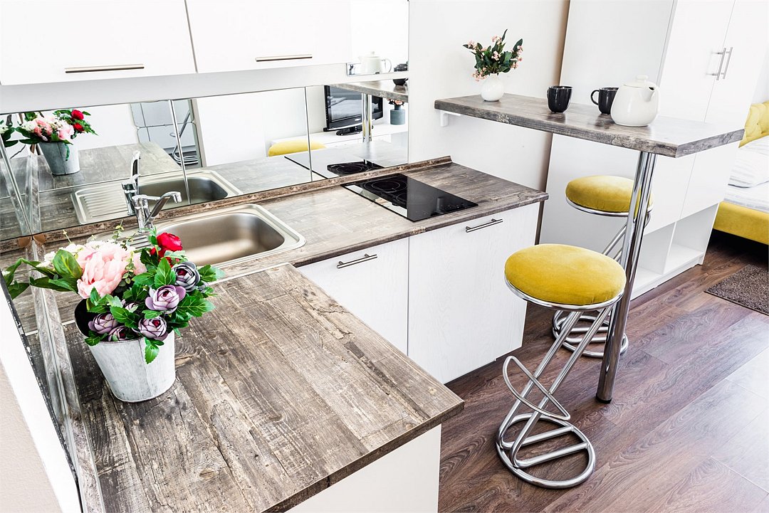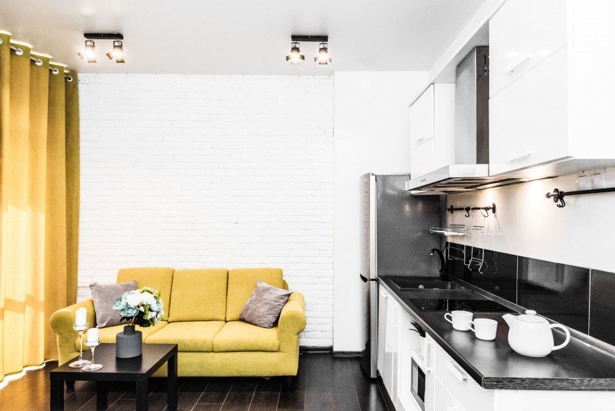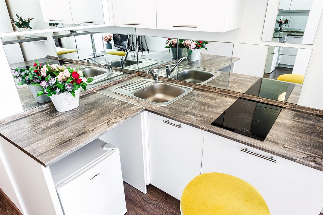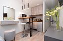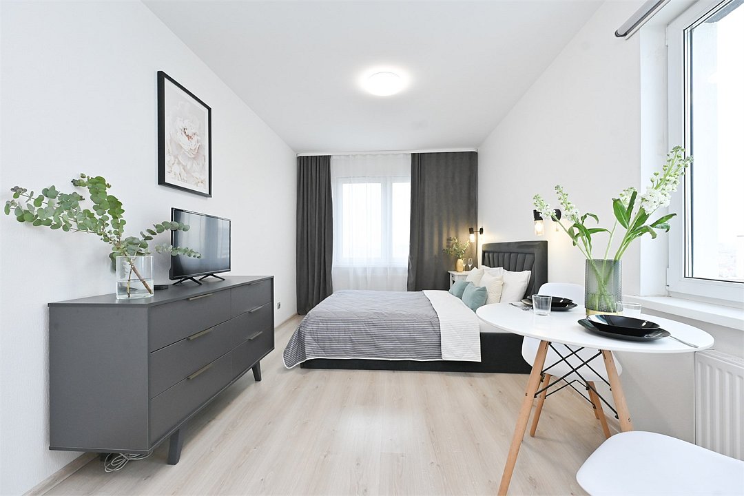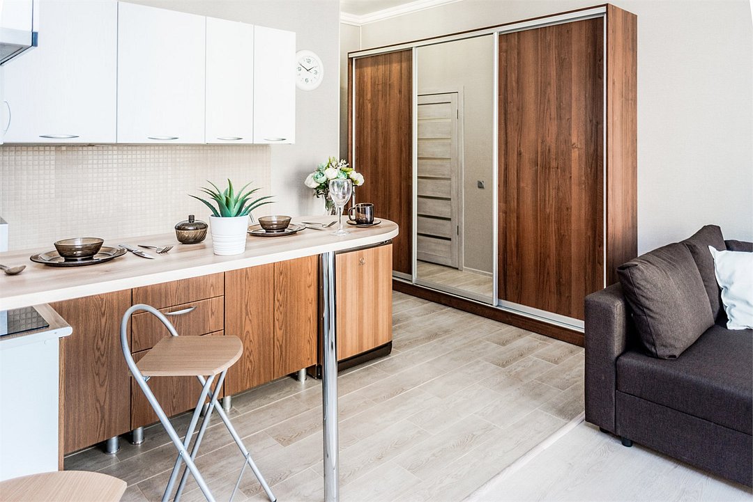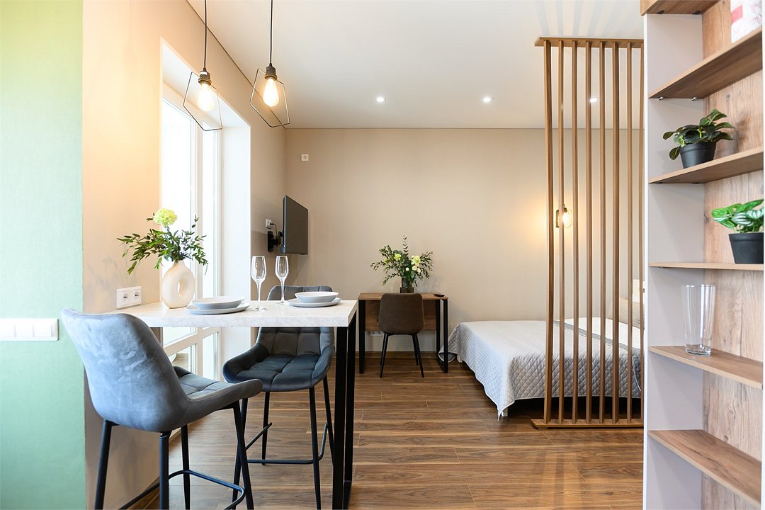 кабельное телевидение, Wi-Fi, фен, плита для приготовления пищи, микроволновая печь, утюг, санузел, банные полотенца, гигиенические средства, двуспальная кровать, гладильная доска, стулья, вешалки, барная стойка, зеркало, комод, набор посуды, стиральная машина, чайник, раковина, отопление, душ, вид на город, вид во двор, кухонная посуда, столовые приборы, туалетные средства, сушилка для белья, телевизор с плоским экраном, мини-холодильник, кухонный уголок, номер для некурящих, набор для приготовления чая и кофе, без питомцевВ студии