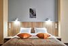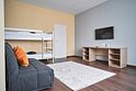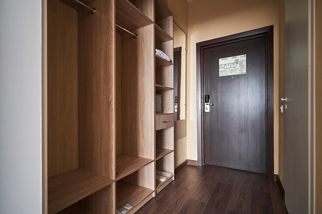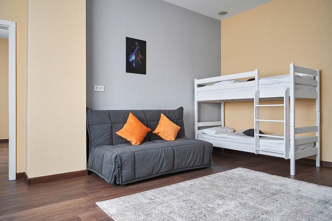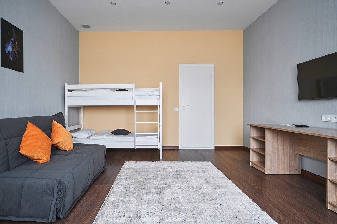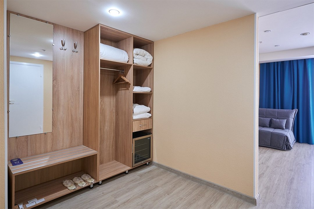 Просторный двухкомнатный номер для большой семьи из 4 человек и более. В одной спальне большая двуспальная кровать и рабочая зона с двумя стульями, в другой раскладной диван шириной 160 см и кровать в два яруса. В каждой комнате телевизор. Для удобства гостей в коридоре находится гардеробная зона. В совмещённой ванной комнате есть все необходимые туалетно-косметические принадлежности.Услуги и удобства
