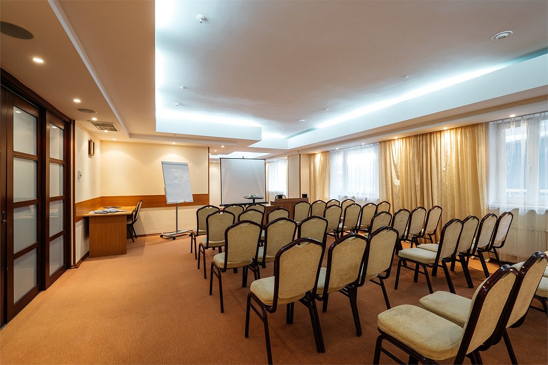 На территории кафе и бара возможна организация банкетов. Первый, в зависимости от рассадки, вмещает до 40 посадочных мест. Второй – до 30 человек. Проведение бизнес-мероприятий предусмотрено в большом конференц-зале отеля 100 кв.м. на 50 мест. Зал отвечает всем современным требованиям оснащенности и удобства.