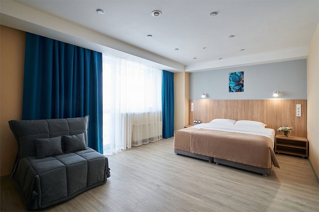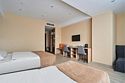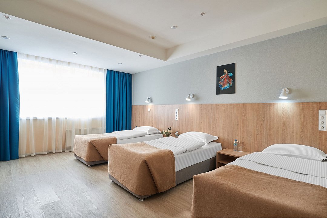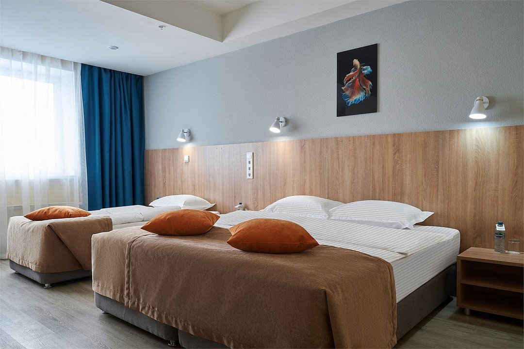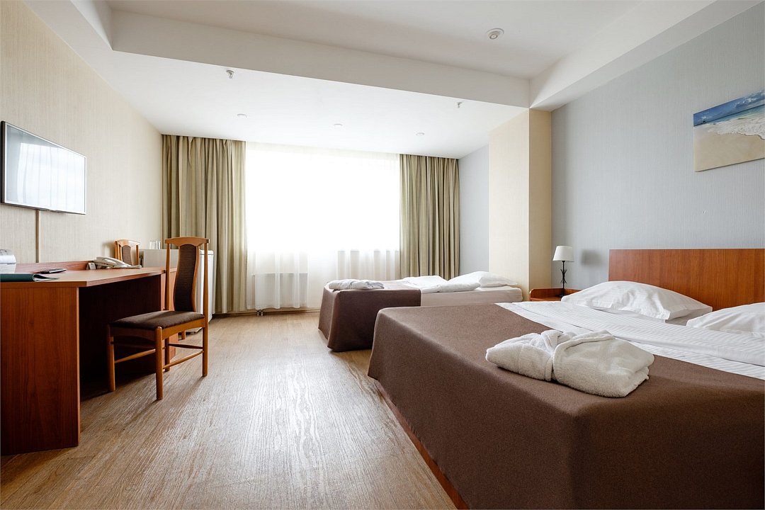 Семейный номер с комфортной двуспальной кроватью, а также односпальной кроватью или креслом-кроватью. Номер оборудован телевизором и отдельной ванной комнатой с миниатюрами гигиенических и косметических средств. Обратите внимание, что номер может иметь разные конфигурации. Четвёртое место может быть представлено евро-раскладушкой.Услуги и удобства