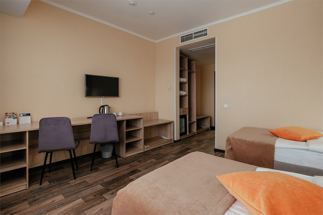 кабельное телевидение, Wi-Fi, телефон, кондиционер, фен, электронные замки, обогреватель, ванная комната, ванна, халаты, банные полотенца, тапочки, гигиенические средства, косметические средства, две односпальные кровати, тумбы, стулья, шкаф для одежды, вешалки, багажная тумба, зеркало, мини-бар, письменные принадлежности, обслуживание номеров, информационная карта, меню, раковина, питьевая вода, отопление, вид на город, кулер на этаже, плиточное покрытие, ламинат, стаканы, туалетные средства, туалет, телевизор с плоским экраном, мини-холодильник, москитная сетка, гостиничная парфюмерия, фанкойл, рабочий стол, услуги прачечной (платно), мылоВ гостиничном номере