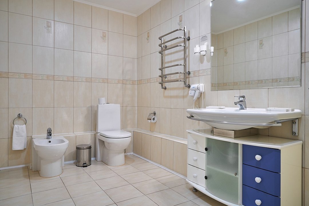 два телевизора, кабельное телевидение, Wi-Fi, телефон, кондиционер, настольные лампы, фен, электронные замки, обогреватель, ванная комната, ванна, биде, халаты, банные полотенца, тапочки, гигиенические средства, косметические средства, двуспальная кровать, тумбы, стулья, шкаф для одежды, вешалки, багажная тумба, зеркало, мини-бар, письменные принадлежности, обслуживание номеров, информационная карта, меню, сейф, раковина, питьевая вода, ковровое покрытие, отопление, вид на город, кулер на этаже, плиточное покрытие, стаканы, туалетные средства, туалет, диван-кровать, раскладной диван, телевизор с плоским экраном, мини-холодильник, москитная сетка, гостиничная парфюмерия, фанкойл, рабочий стол, двухъярусная кровать, услуги прачечной (платно), шапочка для душа, мылоВ гостиничном номере