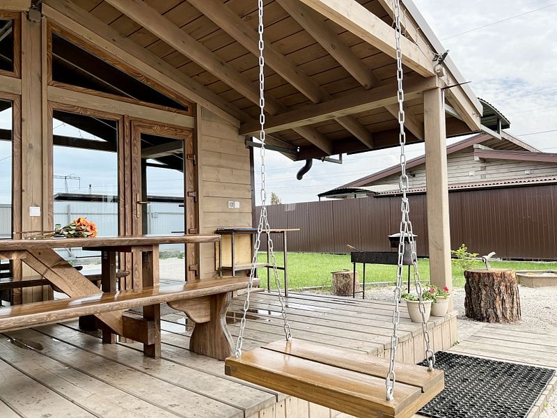 В доме: два больших раскладных дивана; кухня-гостиная со всем необходимым; теплые полы; терраса со столом, скамейками и качелью; мангальная зона.