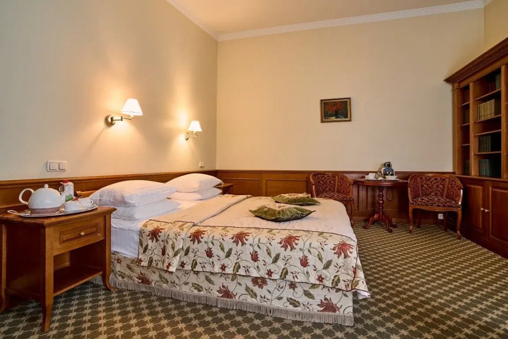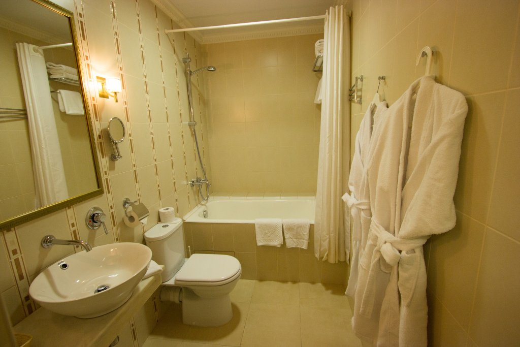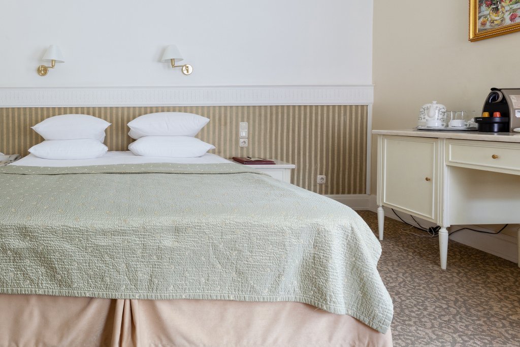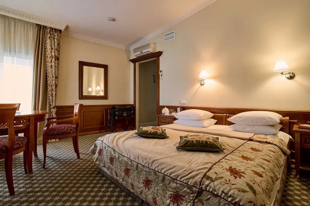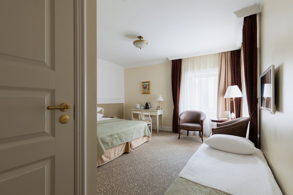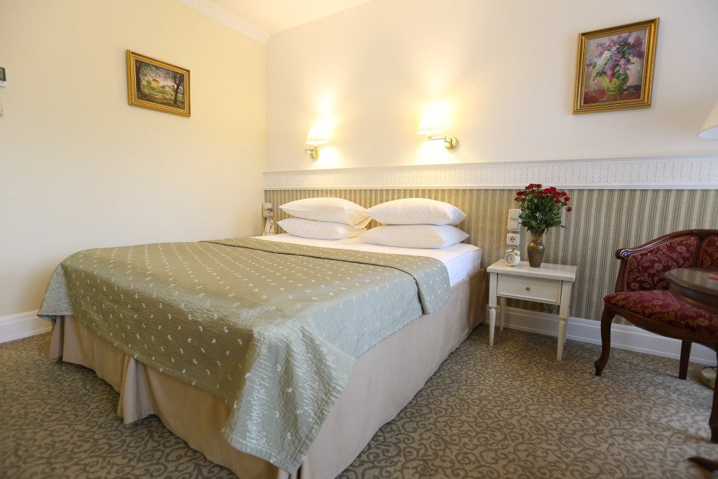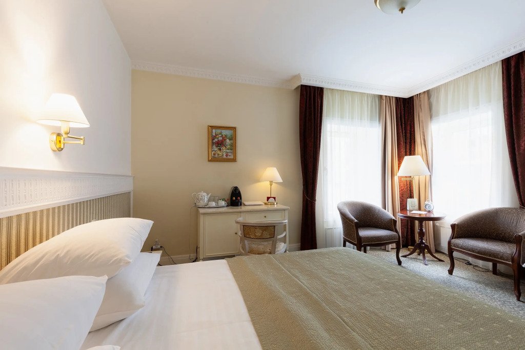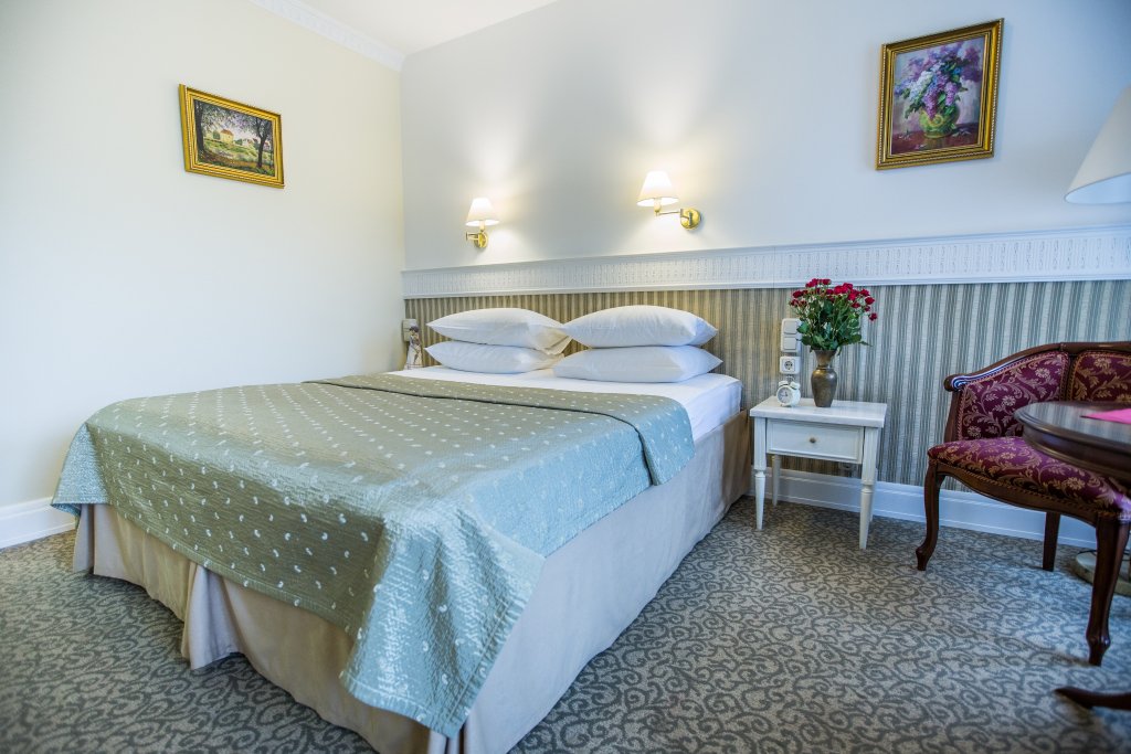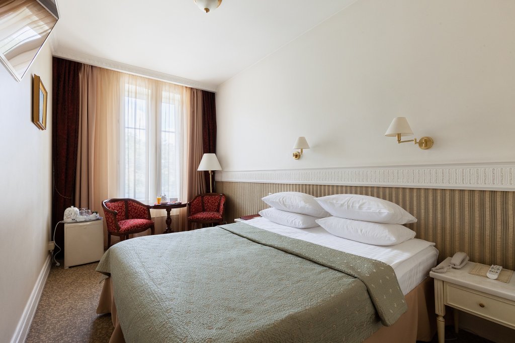 Площадь стандартного номера — 19.0 кв.м. В номере вас будут ждать телевизор, мини-бар, халат и тапочки. Перечисленные услуги есть не во всех номерах.