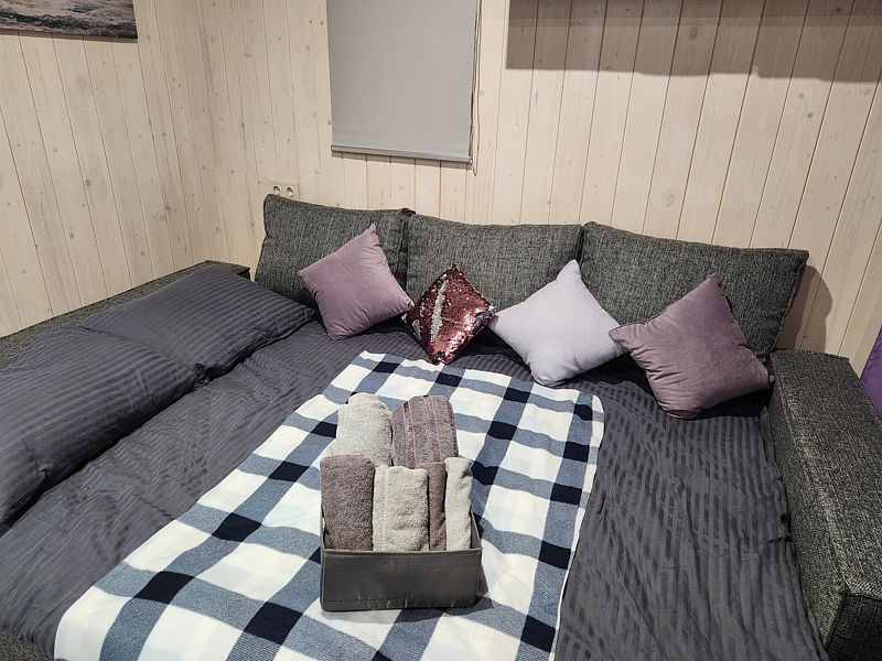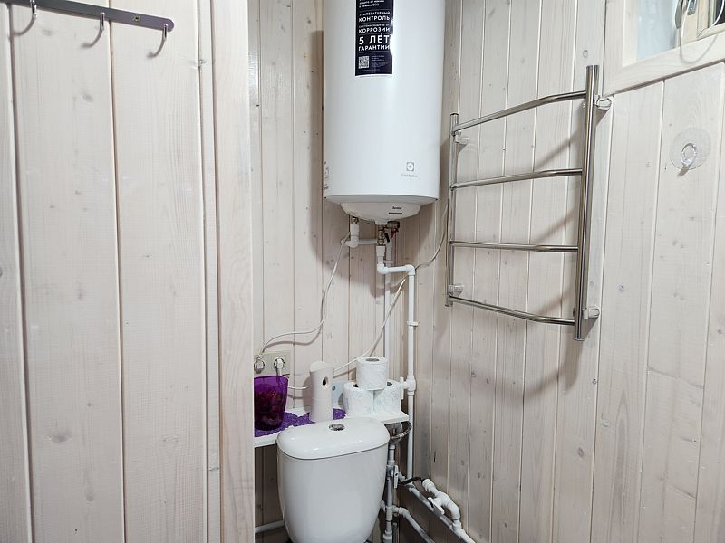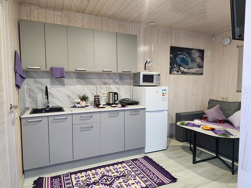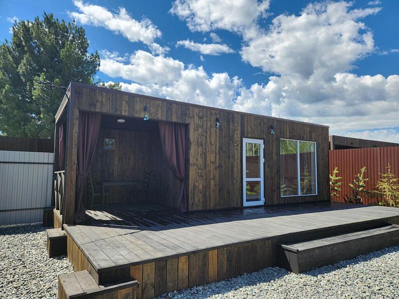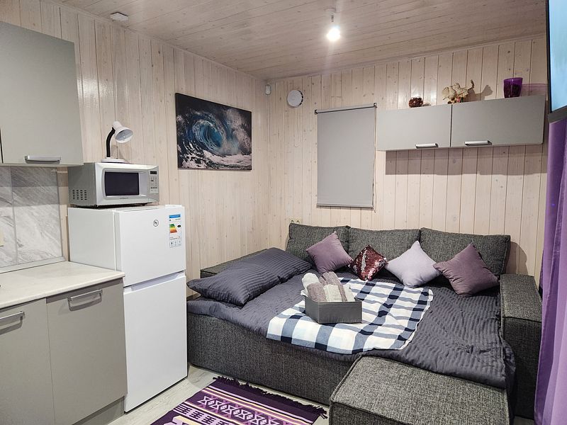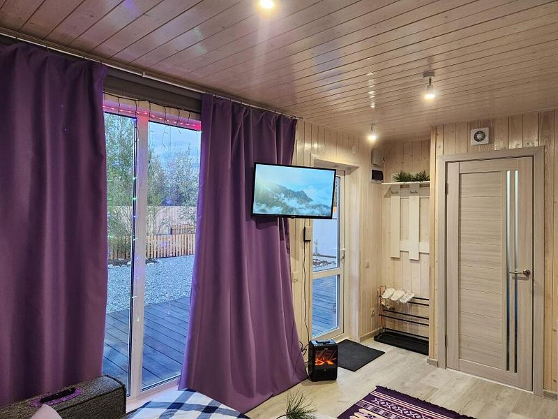 В доме уютно и тепло. Есть все необходимые вещи для проживания: Плита, холодильник, микроволновка, посуда, столовые приборы. Панорамное окно домика открывает прекрасный вид на природу и звездное небо. В санузле теплый пол.