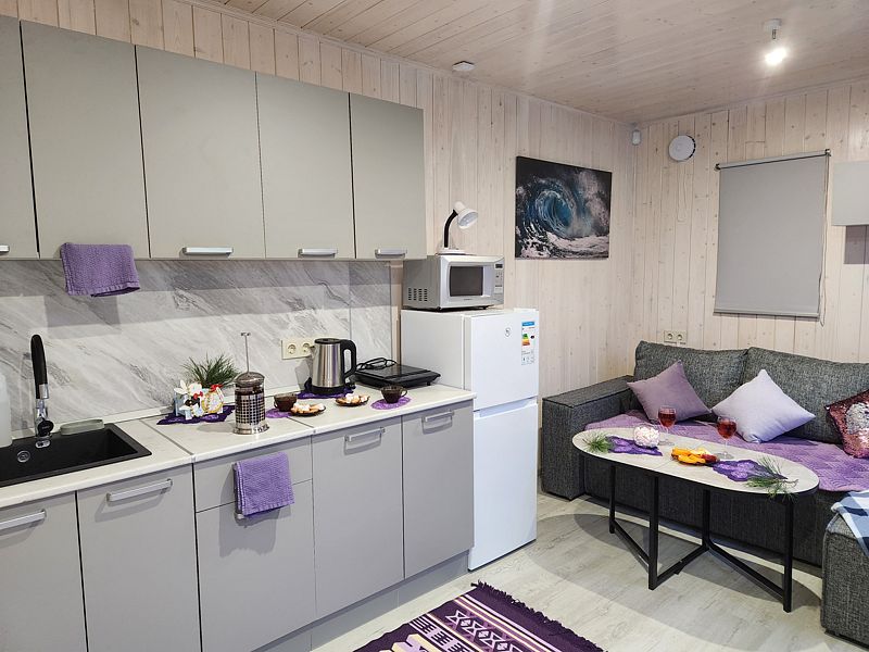 Внутреннее пространство домика отличается уютом и теплом. Здесь есть все необходимое для комфортного проживания: плита, холодильник, микроволновка, посуда и столовые приборы. Панорамное окно открывает захватывающий вид на природу и звездное небо. В санузле установлен теплый пол для дополнительного комфорта.