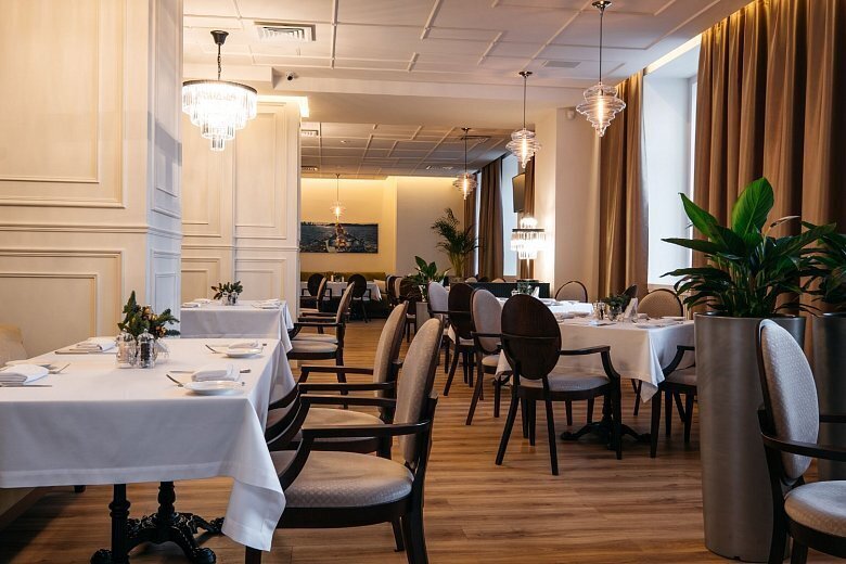 Питание организовано на 1 этаже отеля. На выбор несколько ресторанов: советской кухни «Дубровин», паназиатский ресторан «Васаби», французская кофейня «Шоко», бар «Аlibi» и кабаре «Show girls». Завтрак по системе «шведский стол» подается в ресторане «Дубровин», названном в честь архитектора отеля. Колонны в зале, зеркала, хрусталь на потолке, панно с видами города советского периода создают особую атмосферу. Также на 1 этаже расположен ресторан «Савой», используемый как банкетная площадка на 80 посадочных мест. Интерьер зала отличается утонченностью и аристократизмом его оформления.
