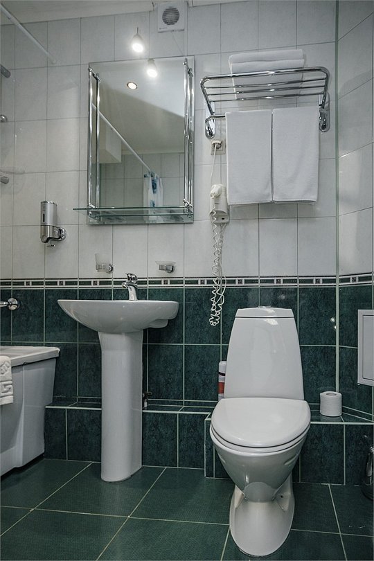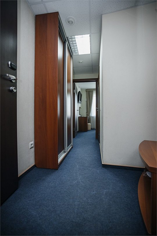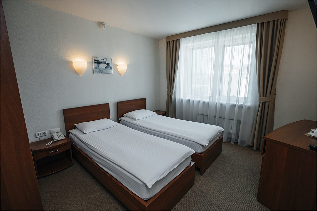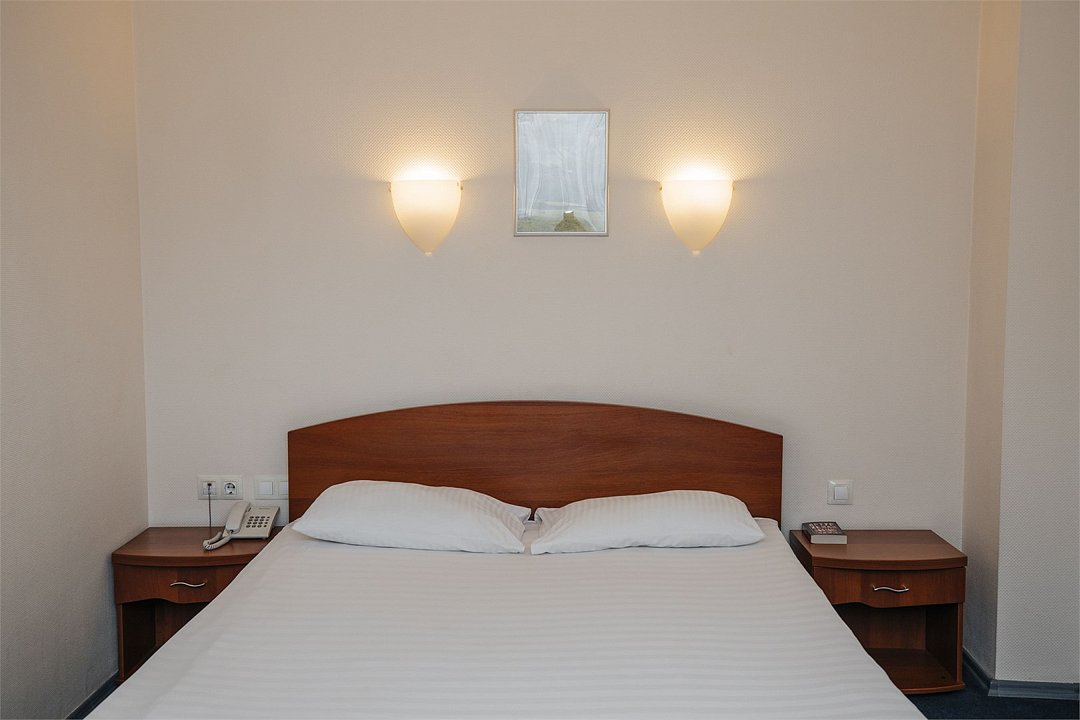 Идеально для отчетных документов. В номере: двуспальная 160*200 или две односпальные кровати 80*200, прикроватные тумбочки, стол, телевизор, чайный набор, шкаф, мини-бар, wi-fi. В санузле: – ванна/душевая кабина, набор полотенец, фен.Услуги и удобства