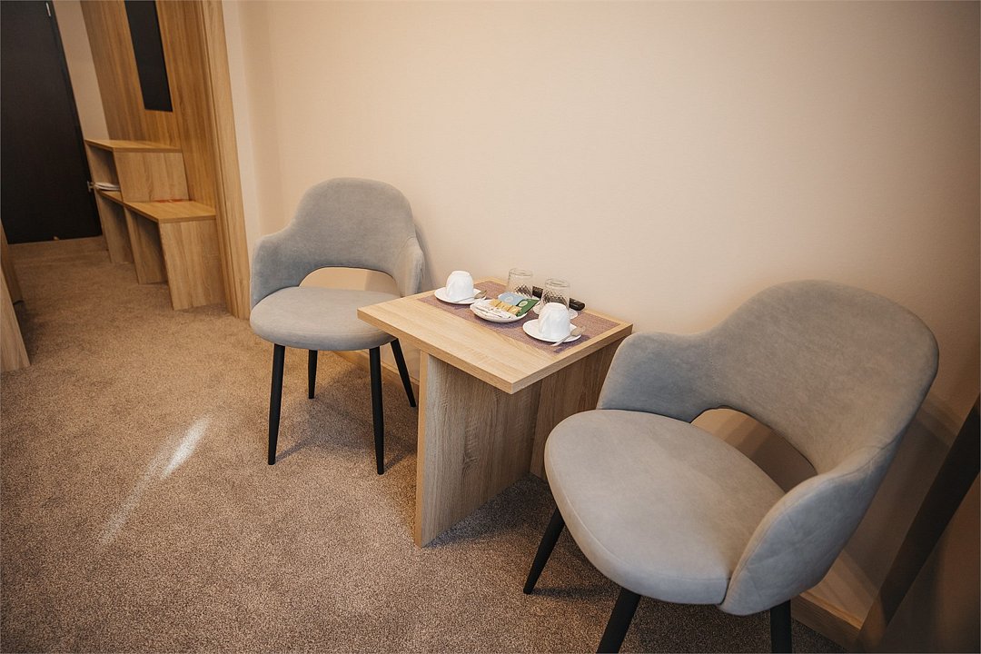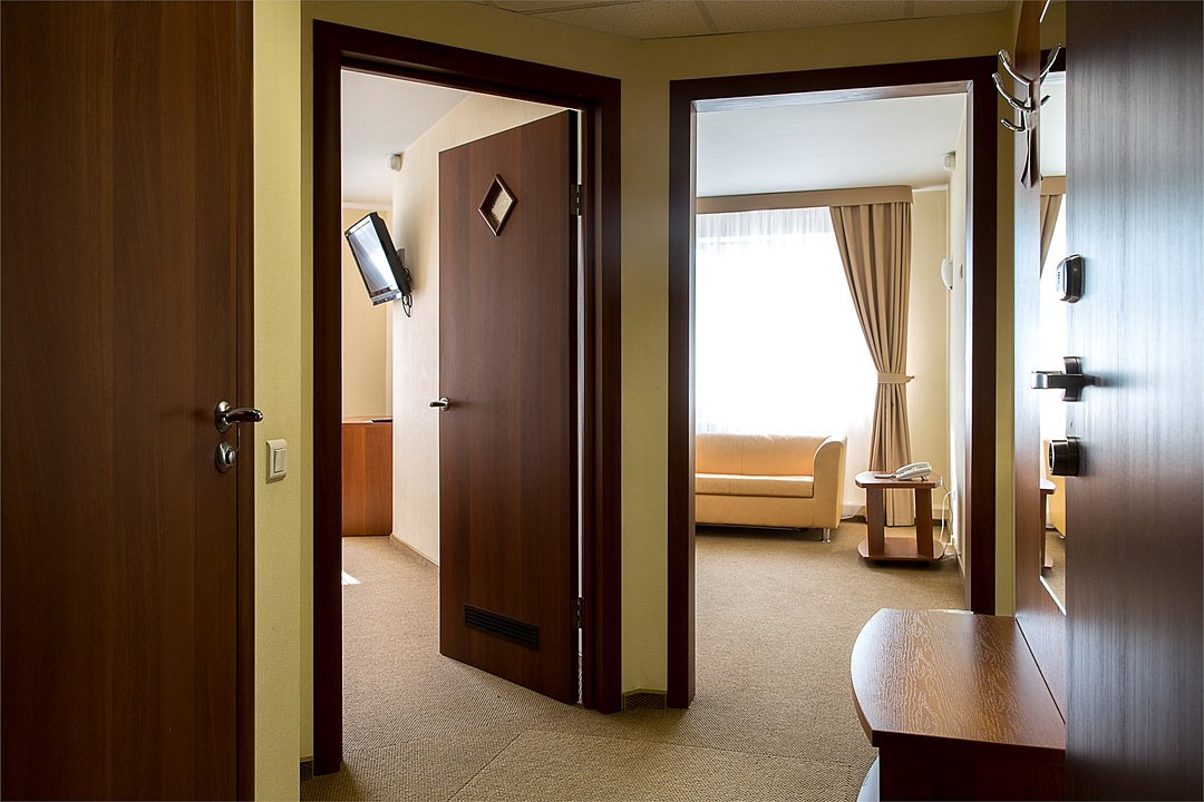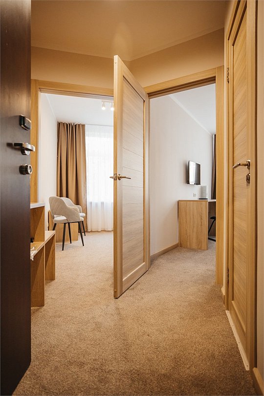 Семейный номер. В первой комнате: две односпальные 80*200 или одна двуспальная кровать 160*200, прикроватные тумбочки, стол, телевизор, мини-бар. Во второй комнате: одноместный диван, журнальный столик, чайный набор. В санузле: душевая кабина или ванна, набор полотенец, фен. Дополнительно в некоторые номера можно поставить детскую кроватку или доп.кровать (раскладушку).Услуги и удобства