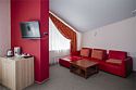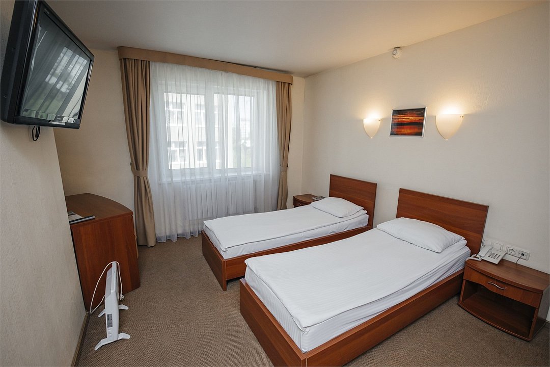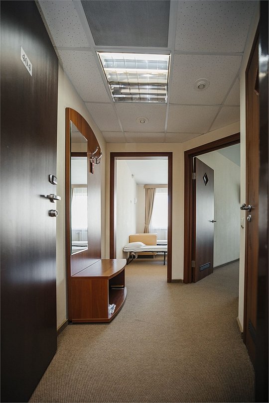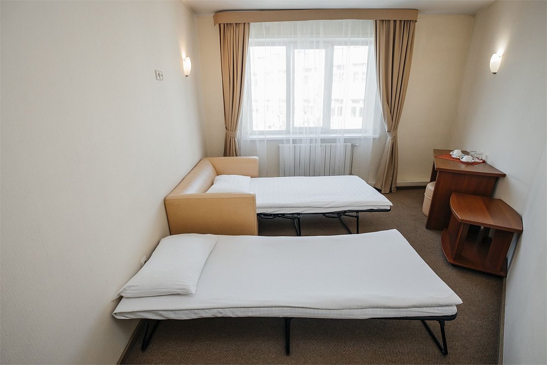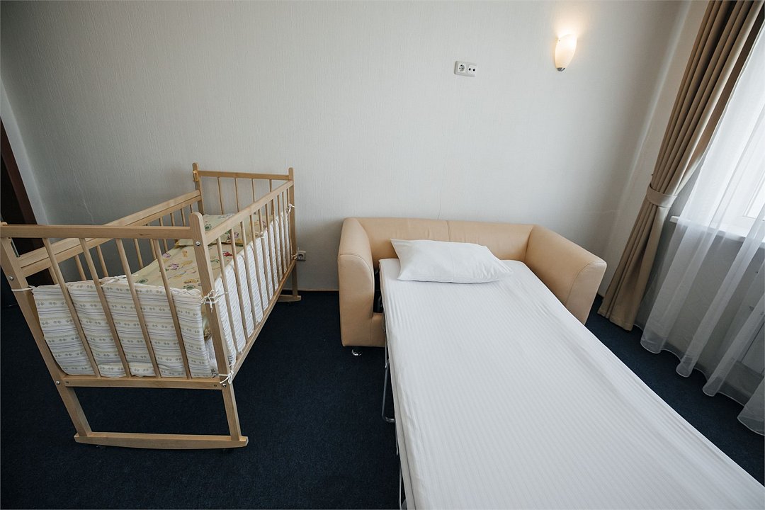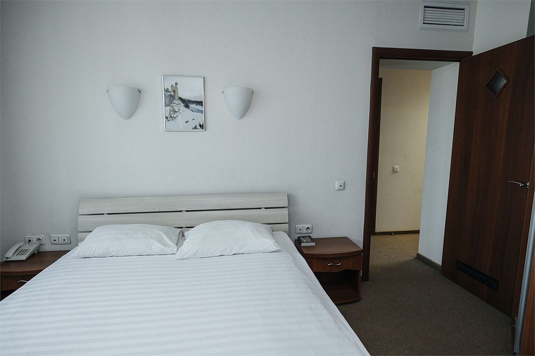 Семейный номер. В первой комнате: две односпальные 80*200, прикроватные тумбочки, стол, телевизор, мини-бар. Во второй комнате: одноместный диван, журнальный столик, чайный набор. В санузле: душевая кабина или ванна, набор полотенец, фен. Дополнительно в некоторые номера можно поставить детскую кроватку или доп.кровать (раскладушку).Услуги и удобства