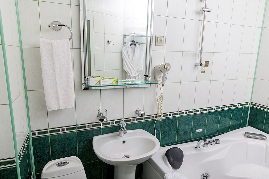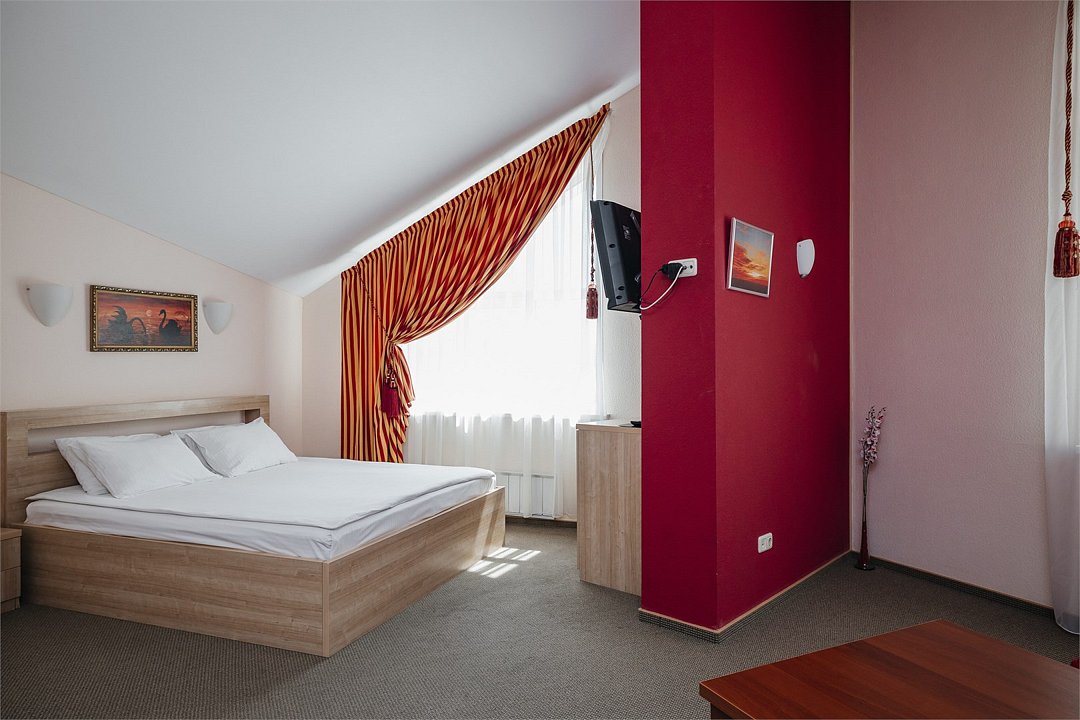 Стильный и современный однокомнатный номер. В номере одна двуспальная кровать, большой диван, телевизор, мини - холодильник, журнальный столик, ванная комната с джакузи или душевой, косметическими средствами, фен, тапочки, халаты.Услуги и удобства