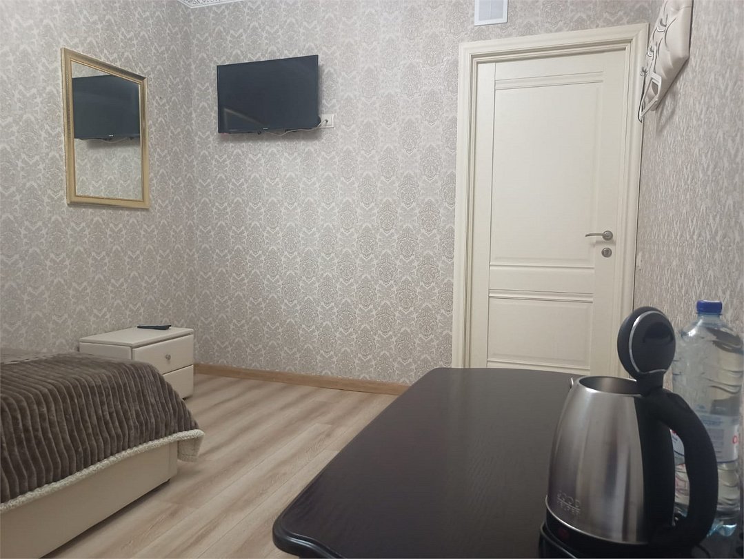 Wi-Fi, кондиционер, банные полотенца, тапочки, кровать «King size», ортопедический матрас, тумбы, журнальный столик, зеркало, чайник, унитаз, раковина, отопление, душ, кулер на этаже, вид во двор, ламинат, столовые приборы, стул, телевизор с плоским экраном, уборка номера, набор для приготовления чая и кофе, вешалки-плечики, бутилированная вода, мыло, затемняющая штора, без питомцевВ номере