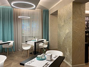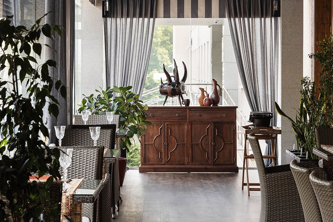 На первом этаже отеля вы найдете ресторан русской и европейской кухни «Де Виль» и ресторан традиционной грузинской кухни «Хинкальная». В теплую пору года гости могут насладиться отдыхом на открытой летней веранде или в уютной зоне с мягкими диванами. Для свадебных торжеств и других праздничных мероприятий в ресторане «Де Виль» доступен новый стильный банкетный зал на 80 персон.