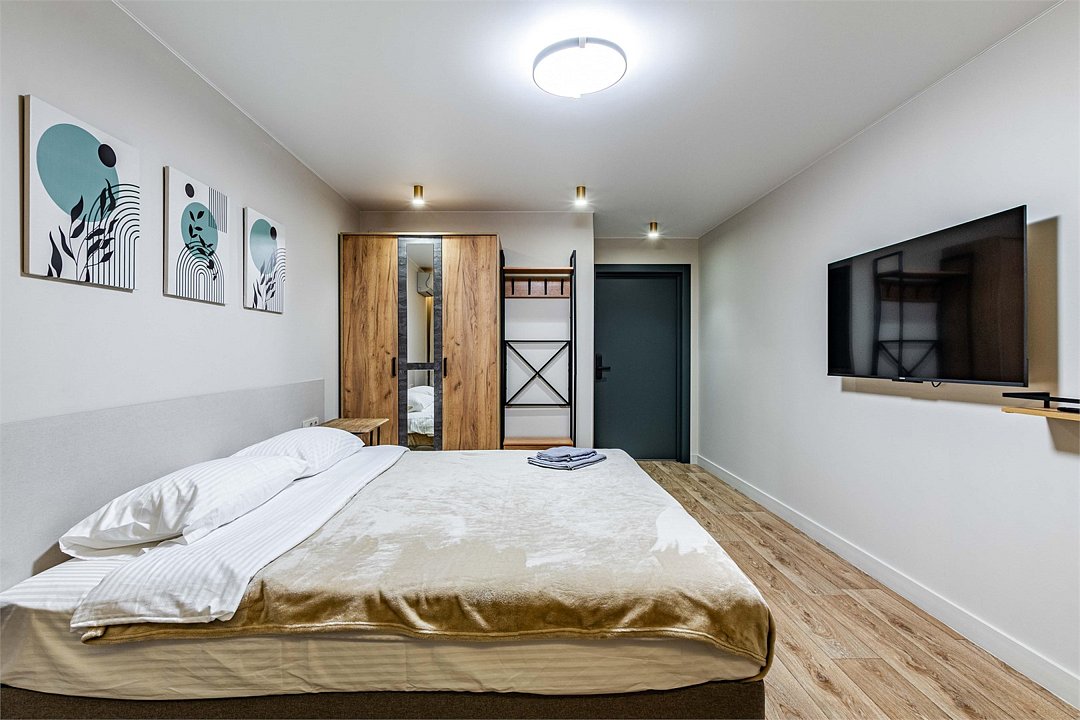 телевизор, Wi-Fi, кондиционер, светильник, фен, утюг, кровать «Queen size», стулья, шкаф для одежды, унитаз, душ, вид во двор, стол, туалет, телевизор с плоским экраном, мини-холодильник, затемняющая штора, Android TVВ квартире