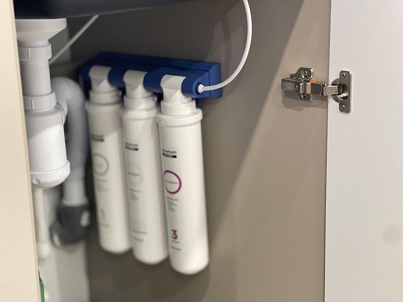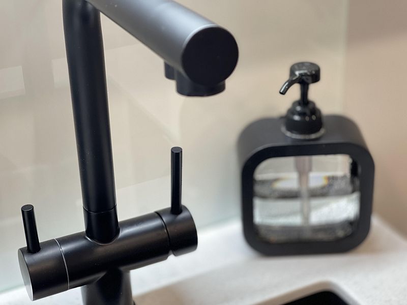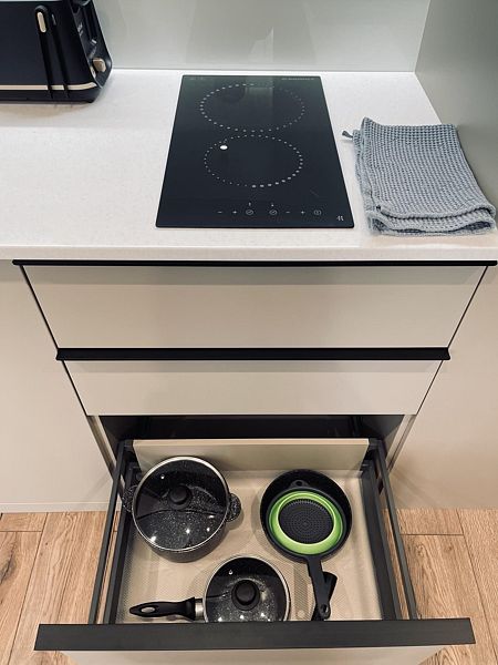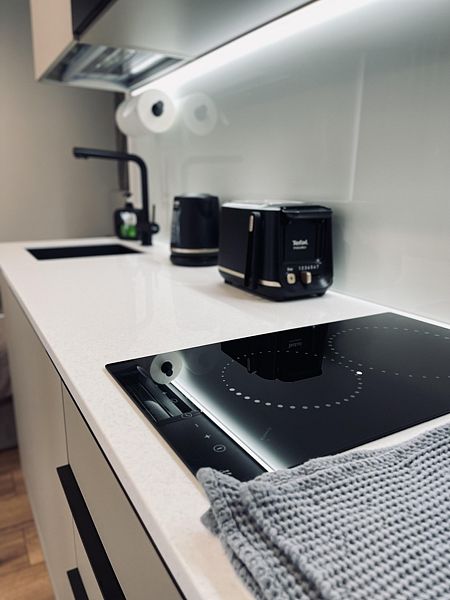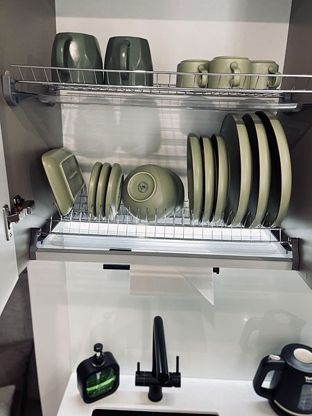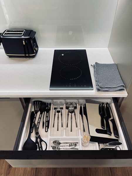 - Кухонный гарнитур с холодильником, микроволновой печью, варочной поверхностью и раковиной, а также всей необходимой кухонной утварью для приготовления блюд. Есть чайник, тостер и столовый сервиз. Вода проходит через систему очистки фильтрами.