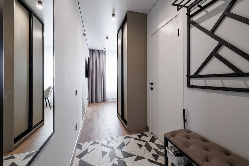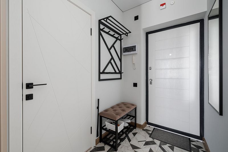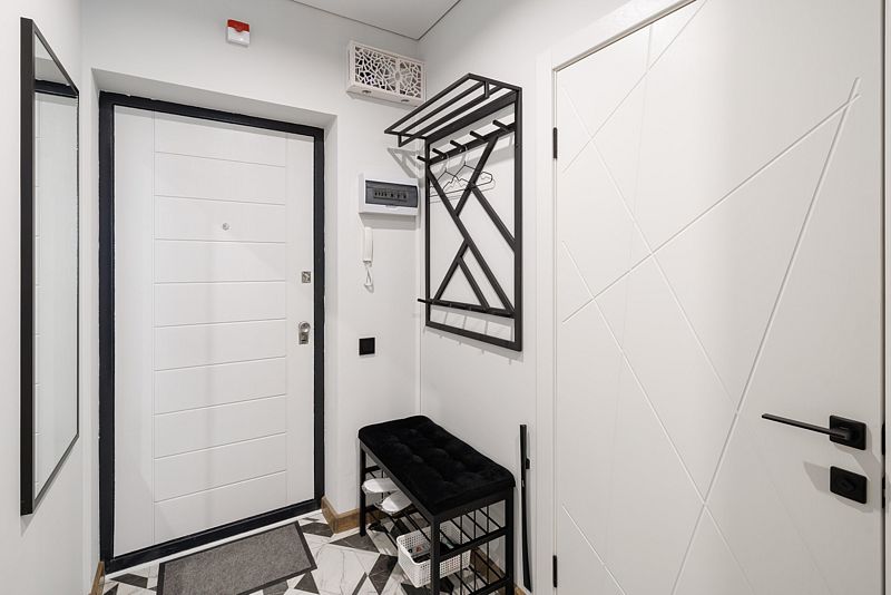 - Прихожая оборудована шкафом-купе, наши гости могут с комфортом расположиться на несколько дней или недель. Есть зеркало в полный рост, вешалки для верхней одежды и плечики, пуф-обувница, средства для чистки и дезодорант для обуви. Каждому клиенту — одноразовые тапочки.