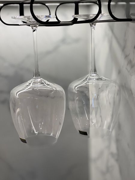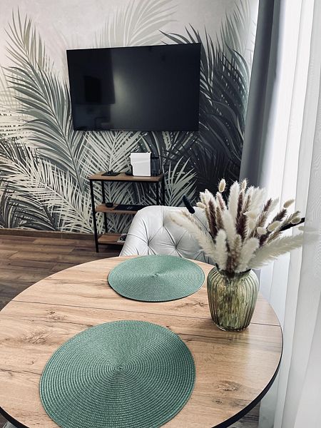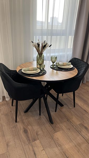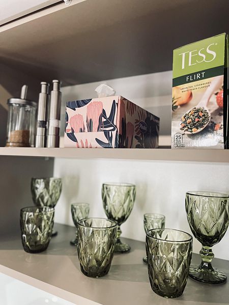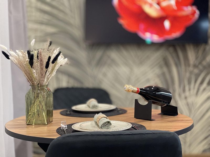 - Обеденная зона состоящая из стола и двух комфортных стульев. Для сервировки стола ежедневной или праздничной вы найдете комплект сервировочных салфеток, свечи, бокалы, рюмки, стаканы, бутылочницу, электроштопор и столовые приборы.